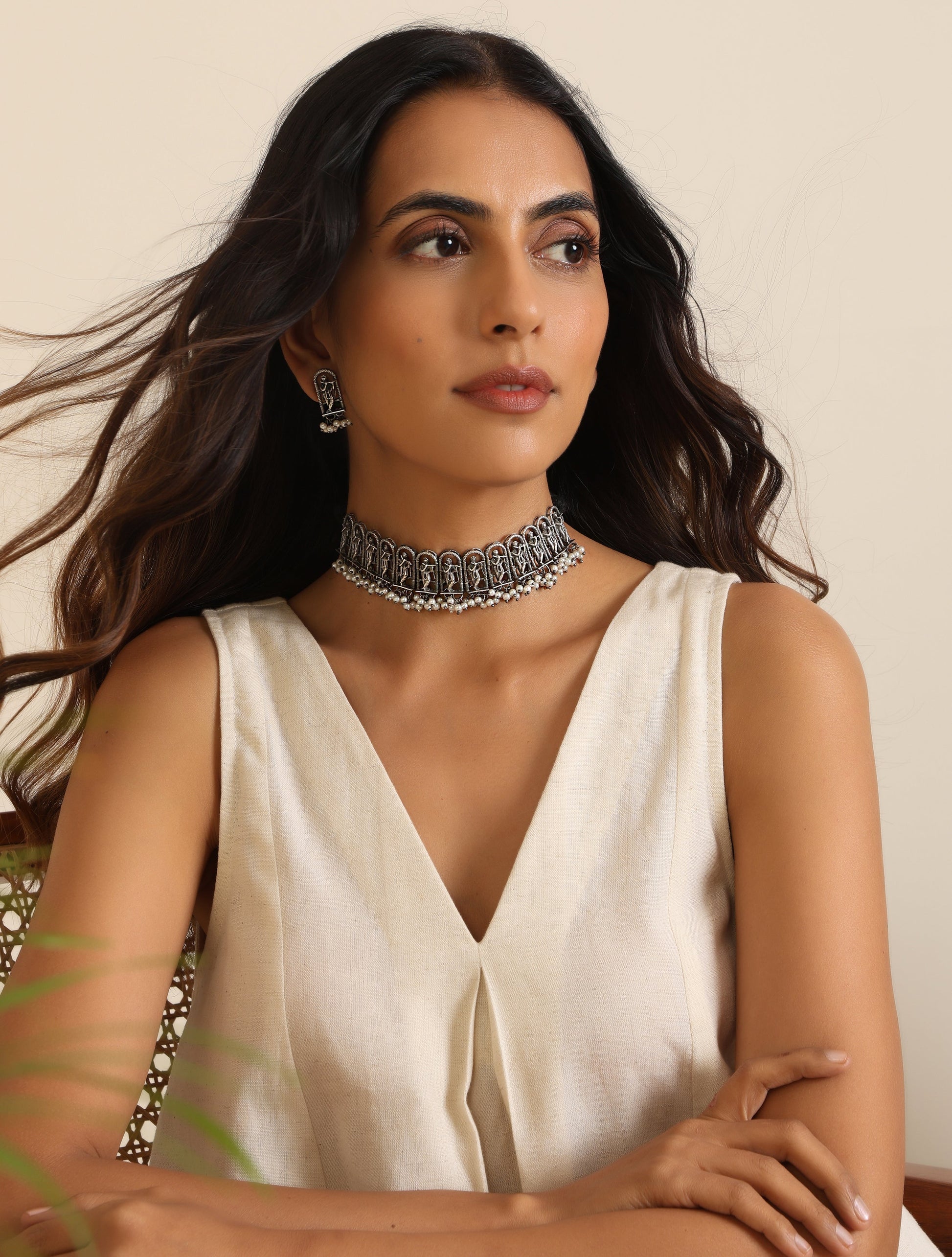 - Oxidised silver idol choker set with Drawstring, Post and Back closure.