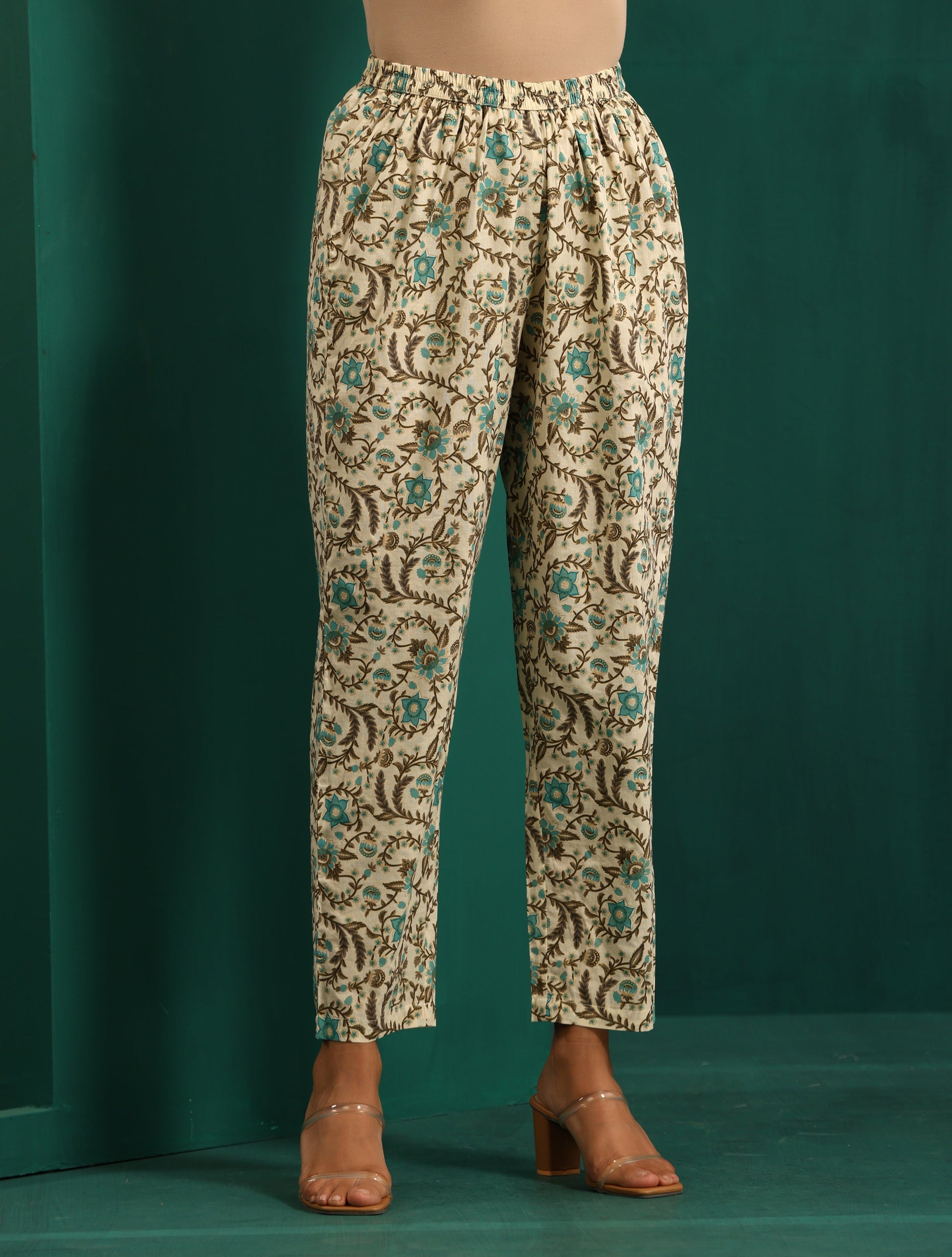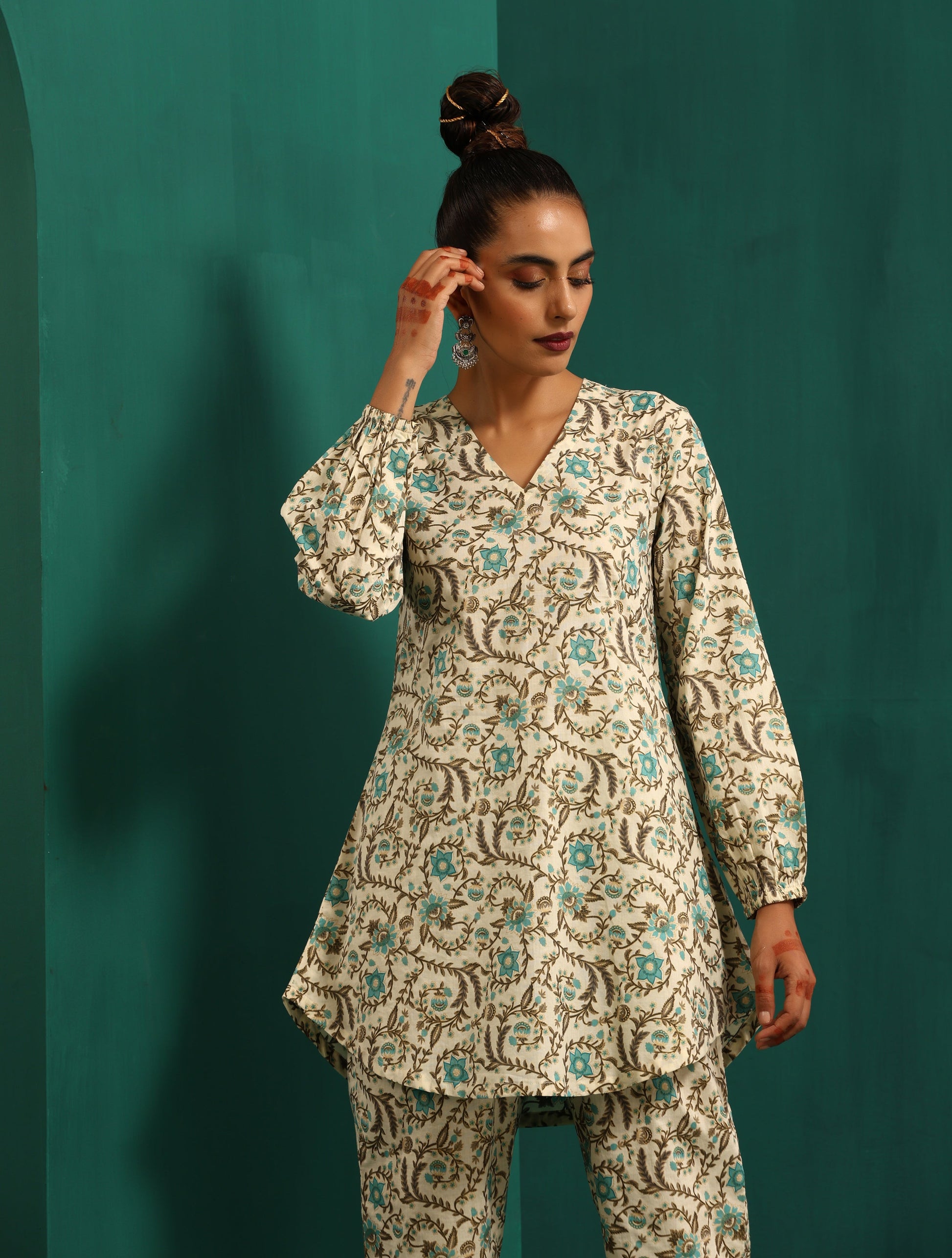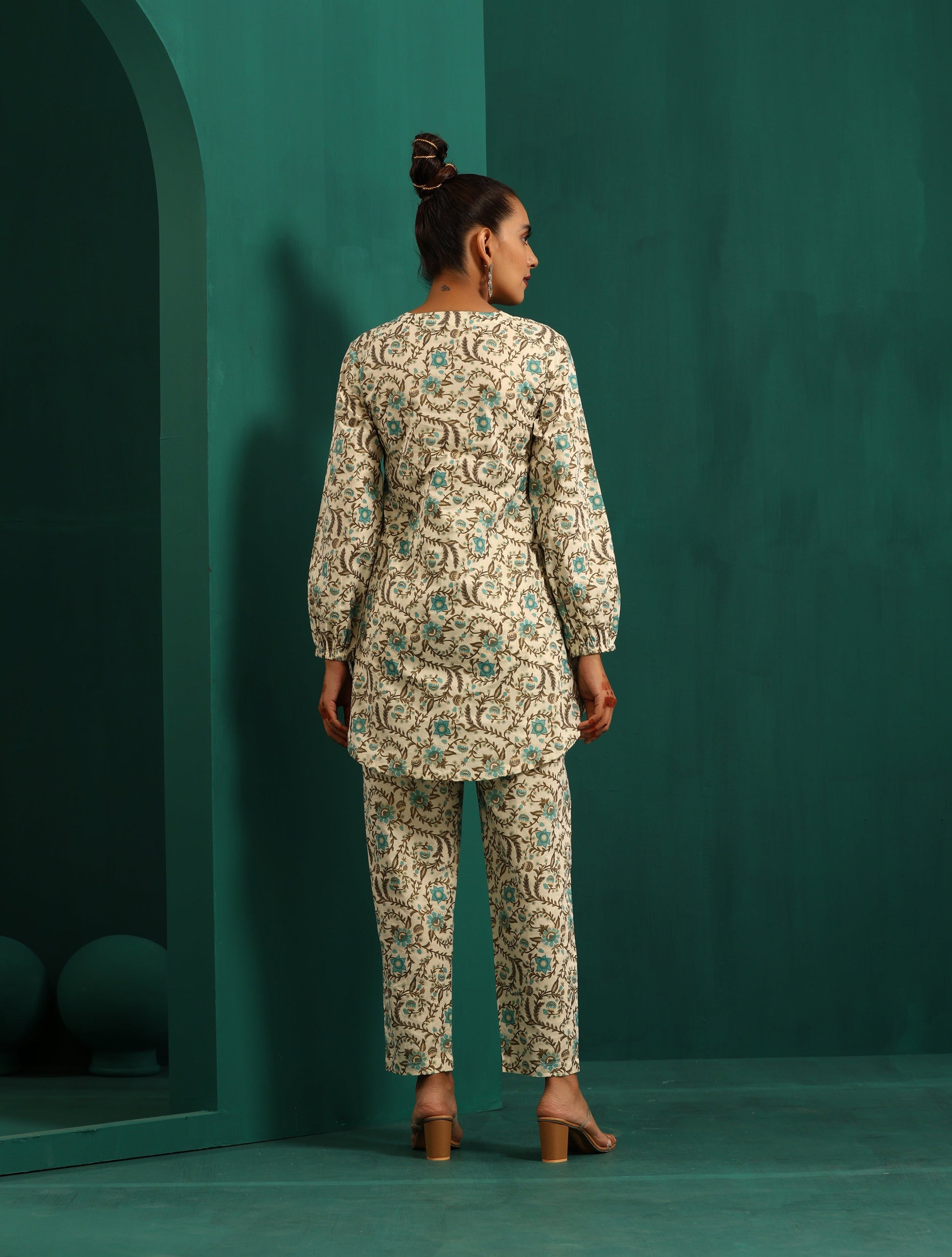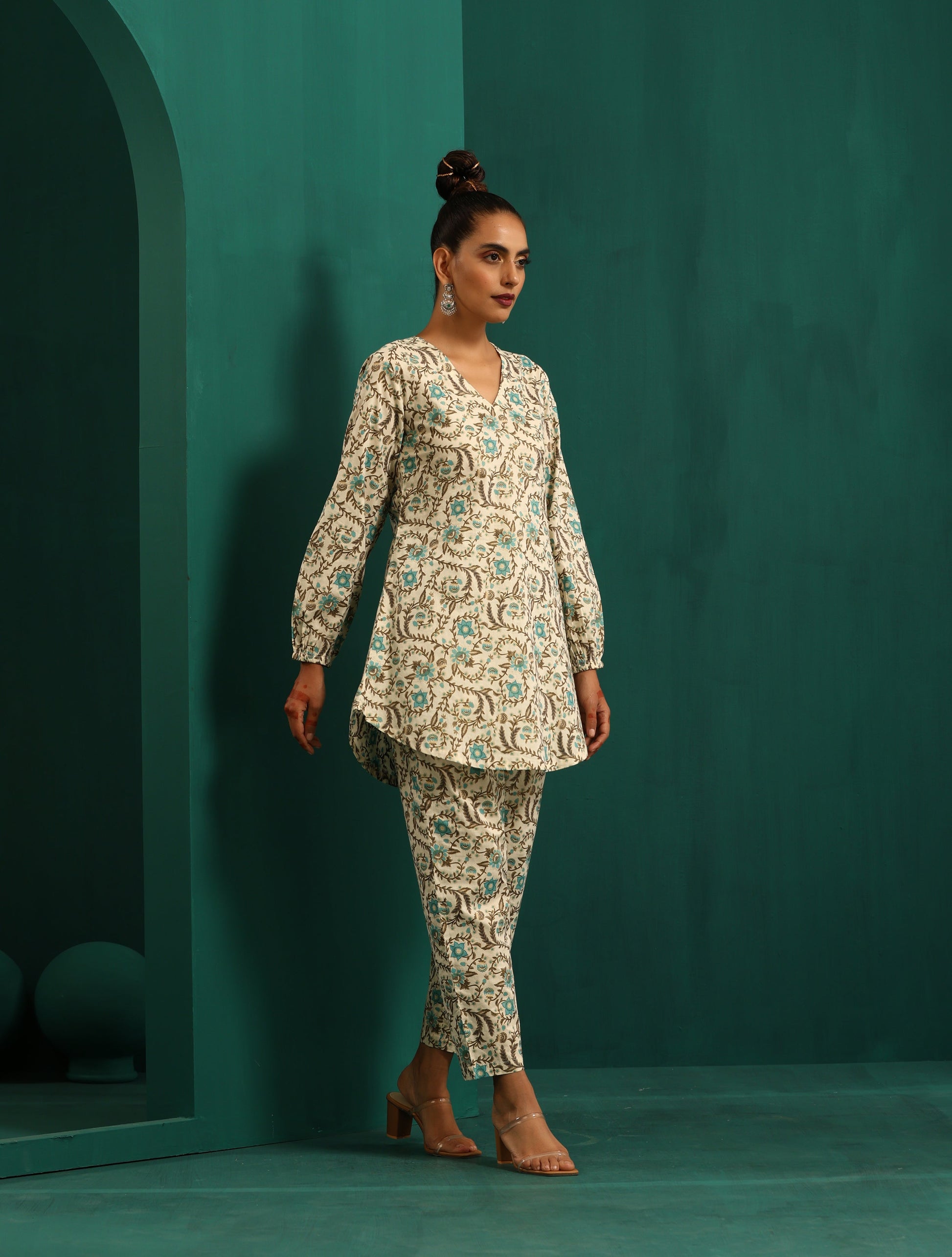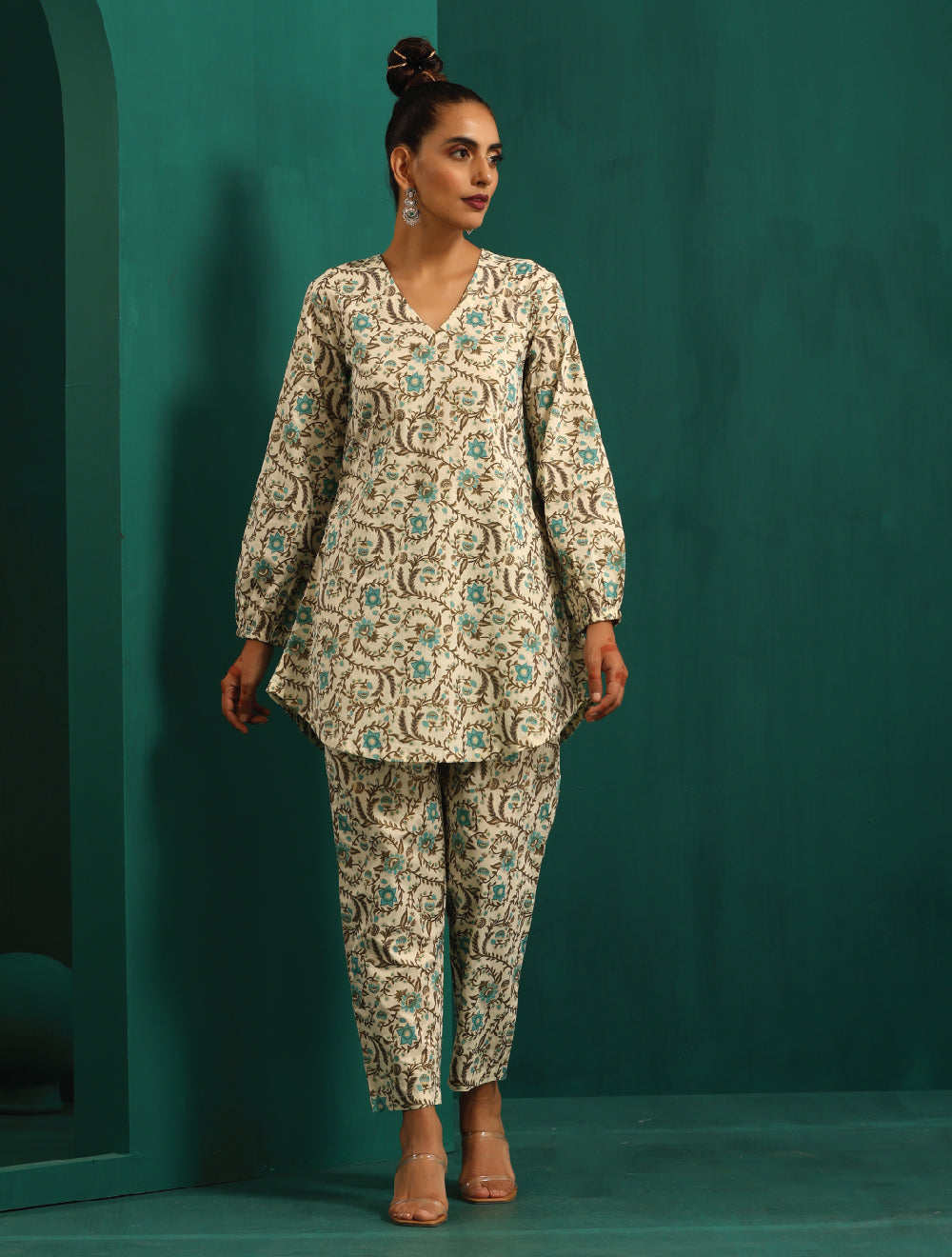 - Cotton Floral Printed Co-Ord Set with V-neck and gathered sleeve. Paired with elasticated waist pant.