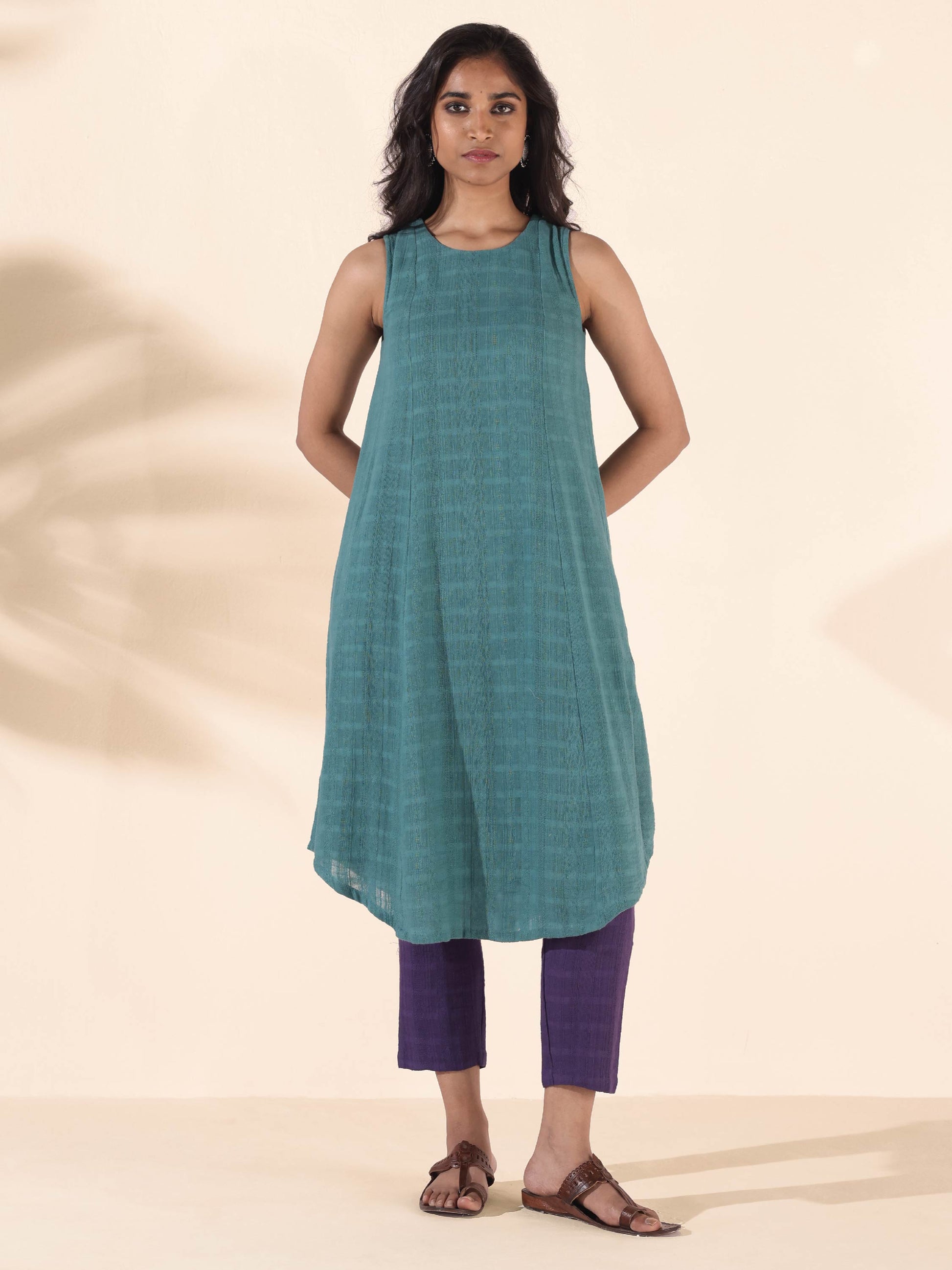 trueBrowns Turquoise Cotton Dobby Sleeveless Kurta Pant Set