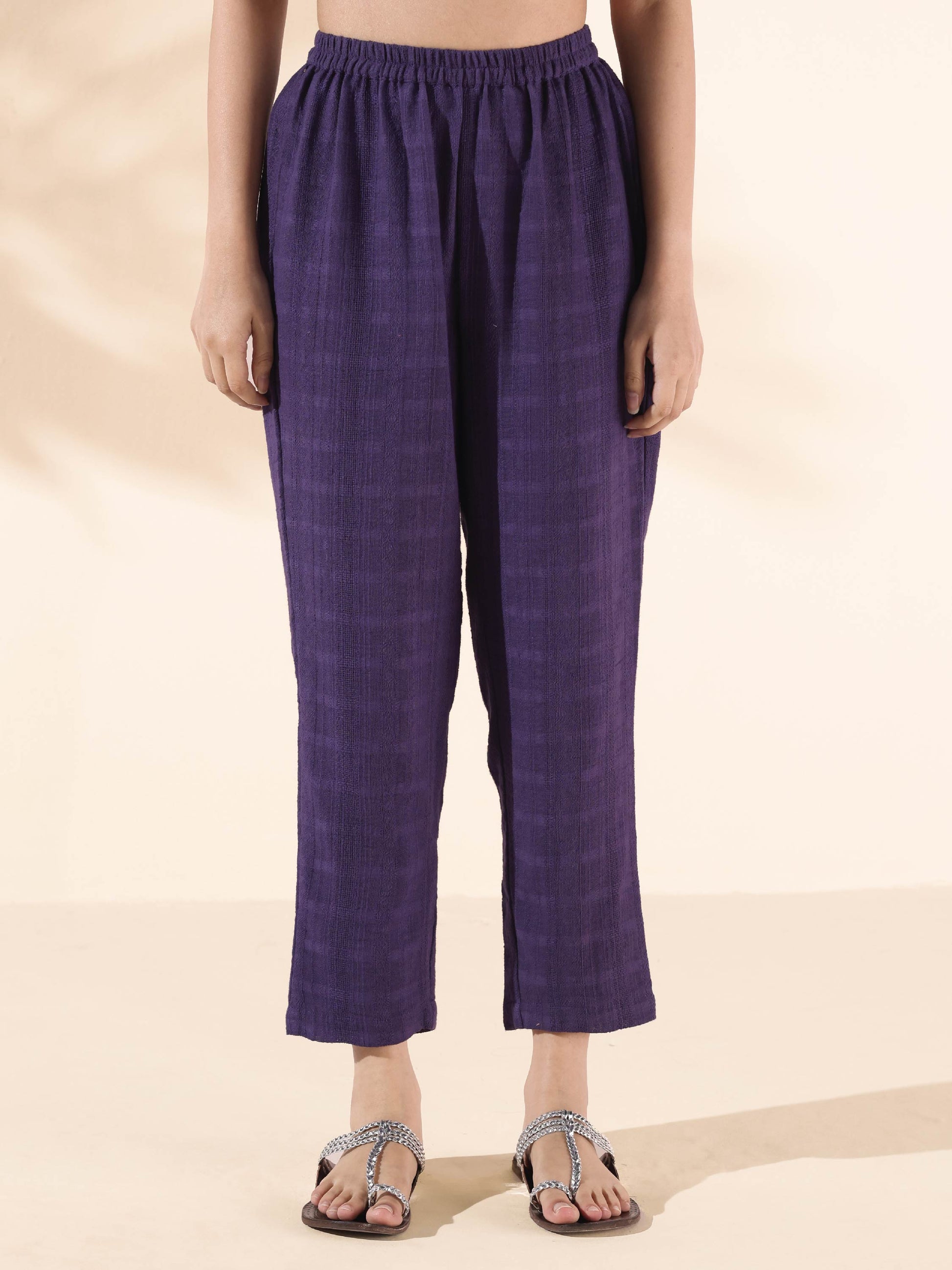- Cotton Dobby Sleeveless Kurta with Round neckline and pockets. Paired with elasticated waist pant.