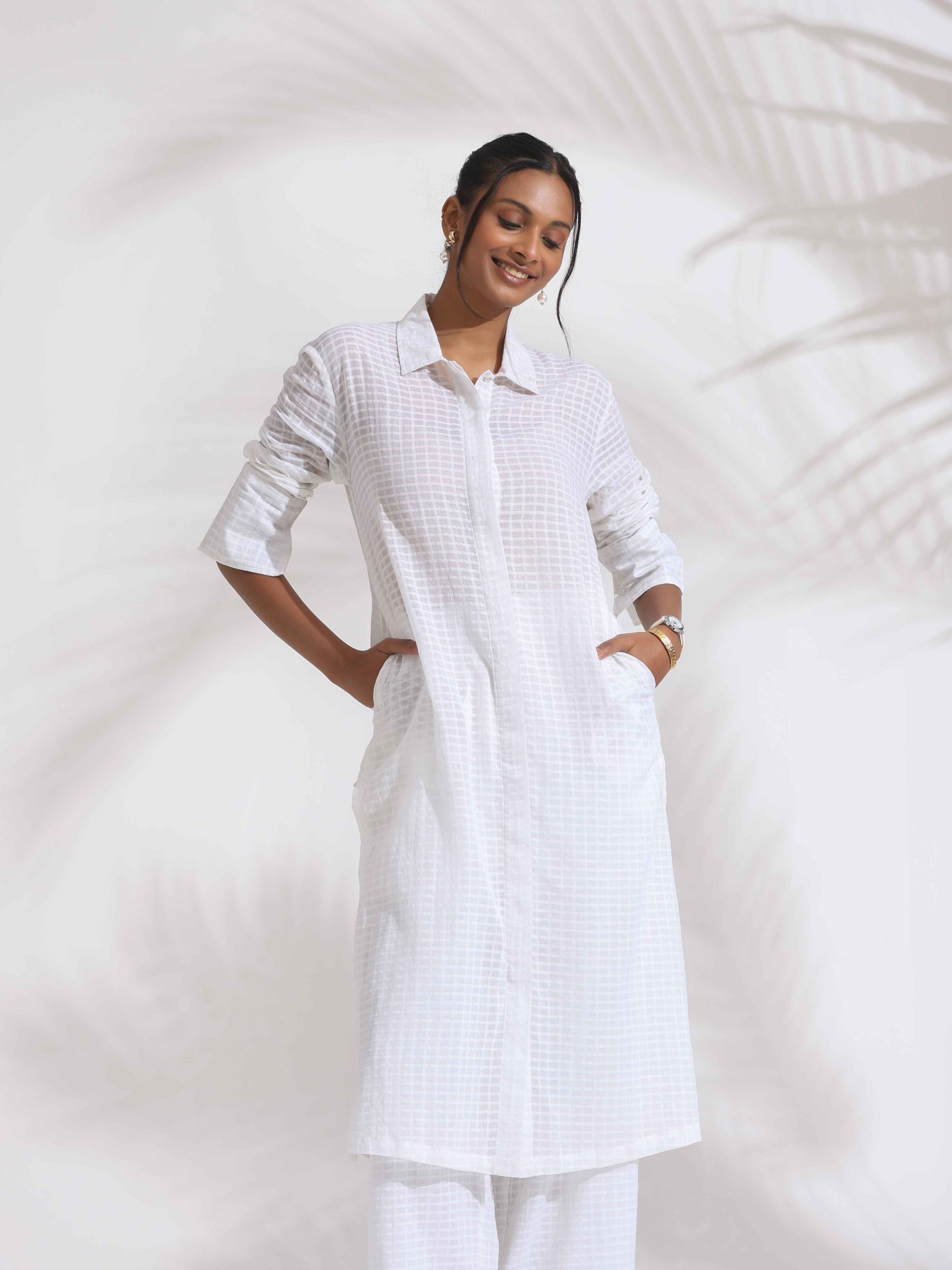 - Elevate your style with this white cotton dobby front-button kurta, featuring a light, sheer fabric for a breezy, effortless look. Paired with white cotton dobby pants. Add a pop of color with a bralette for a chic twist—this ensemble is perfect comfort with an edge.