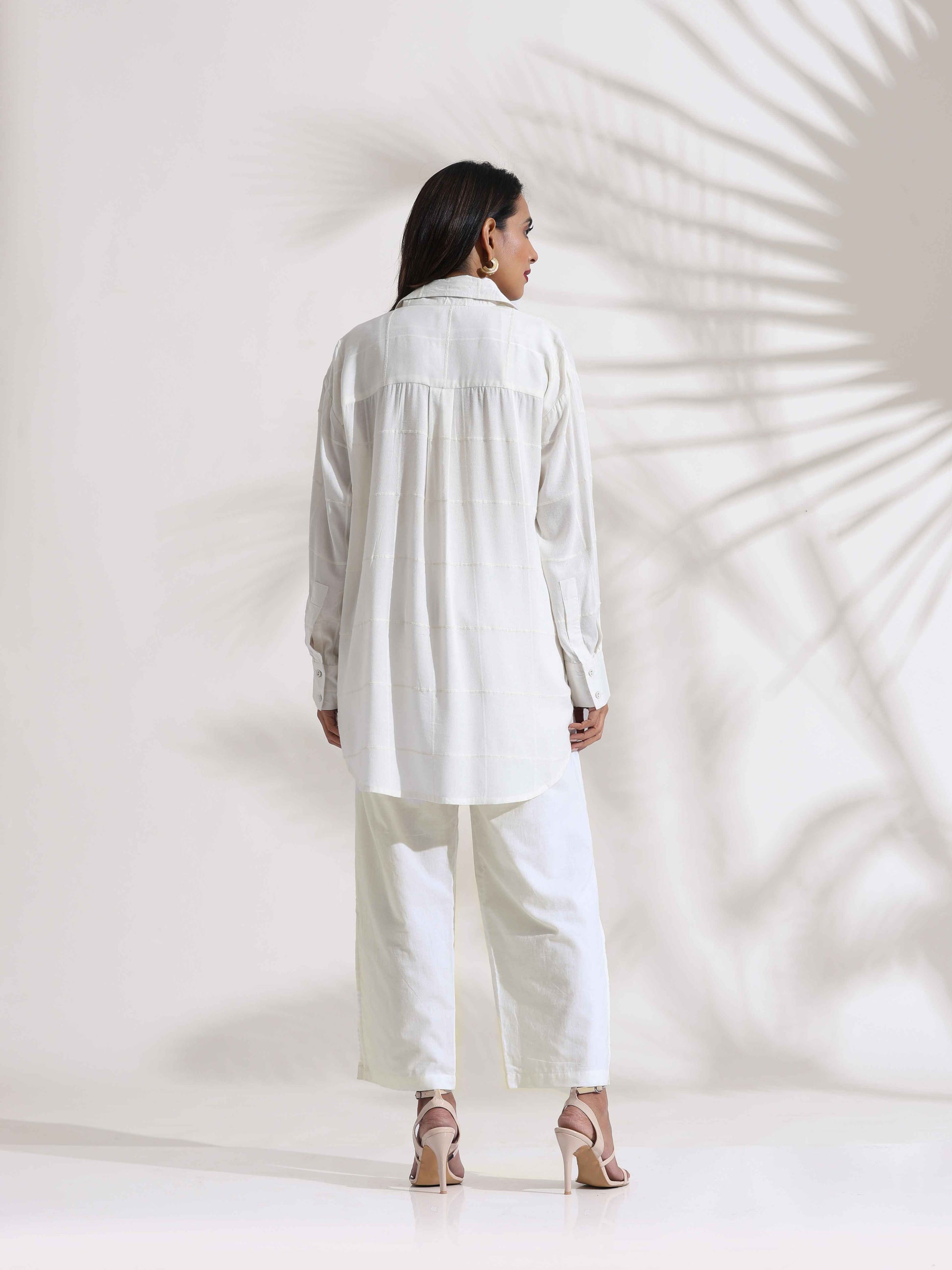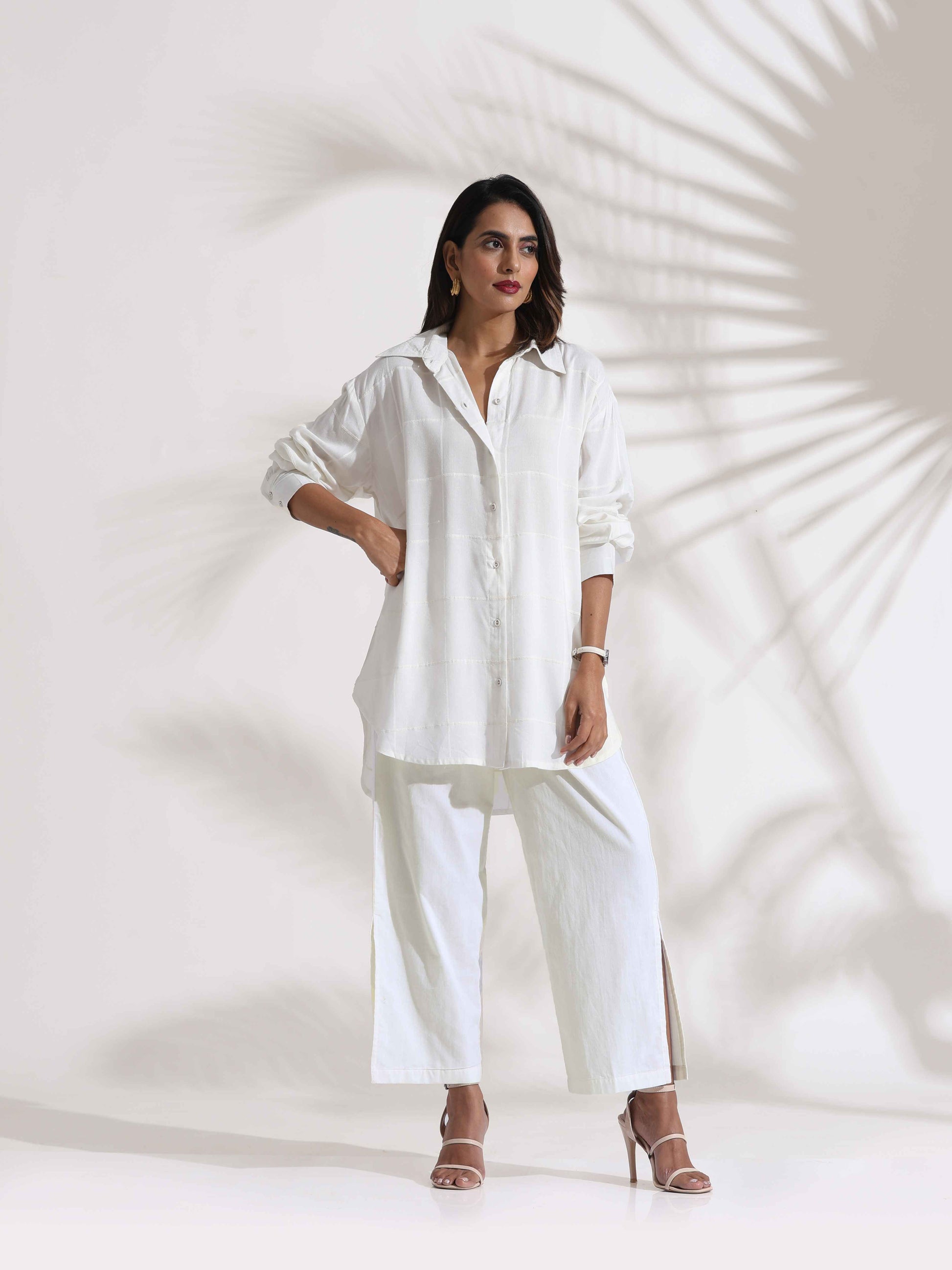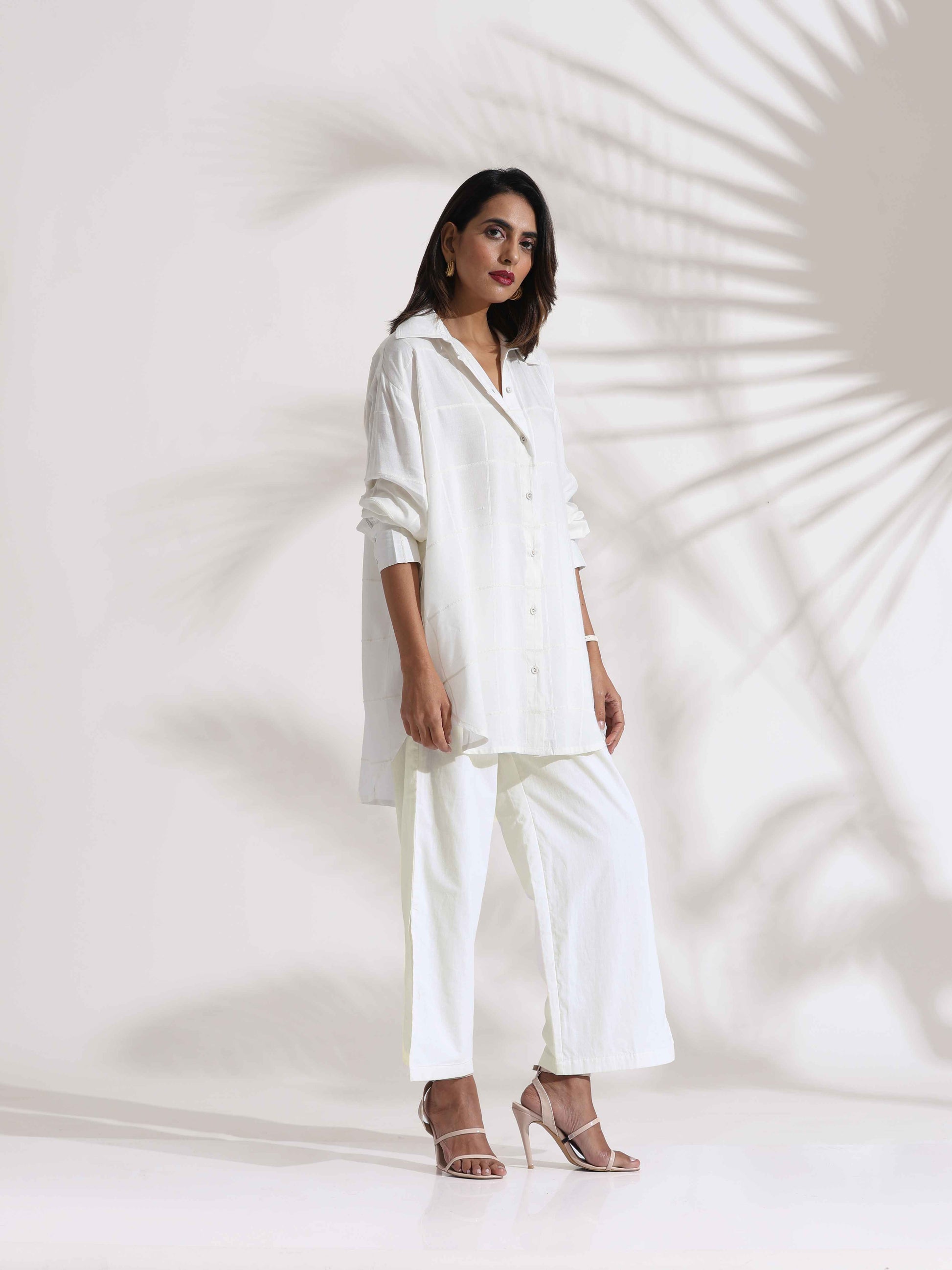 - Elevate your style with this white cotton dobby shirt top paired with pants which has side slit for add on detail. The top has curved hem along with back yoke and box pleat for ease.