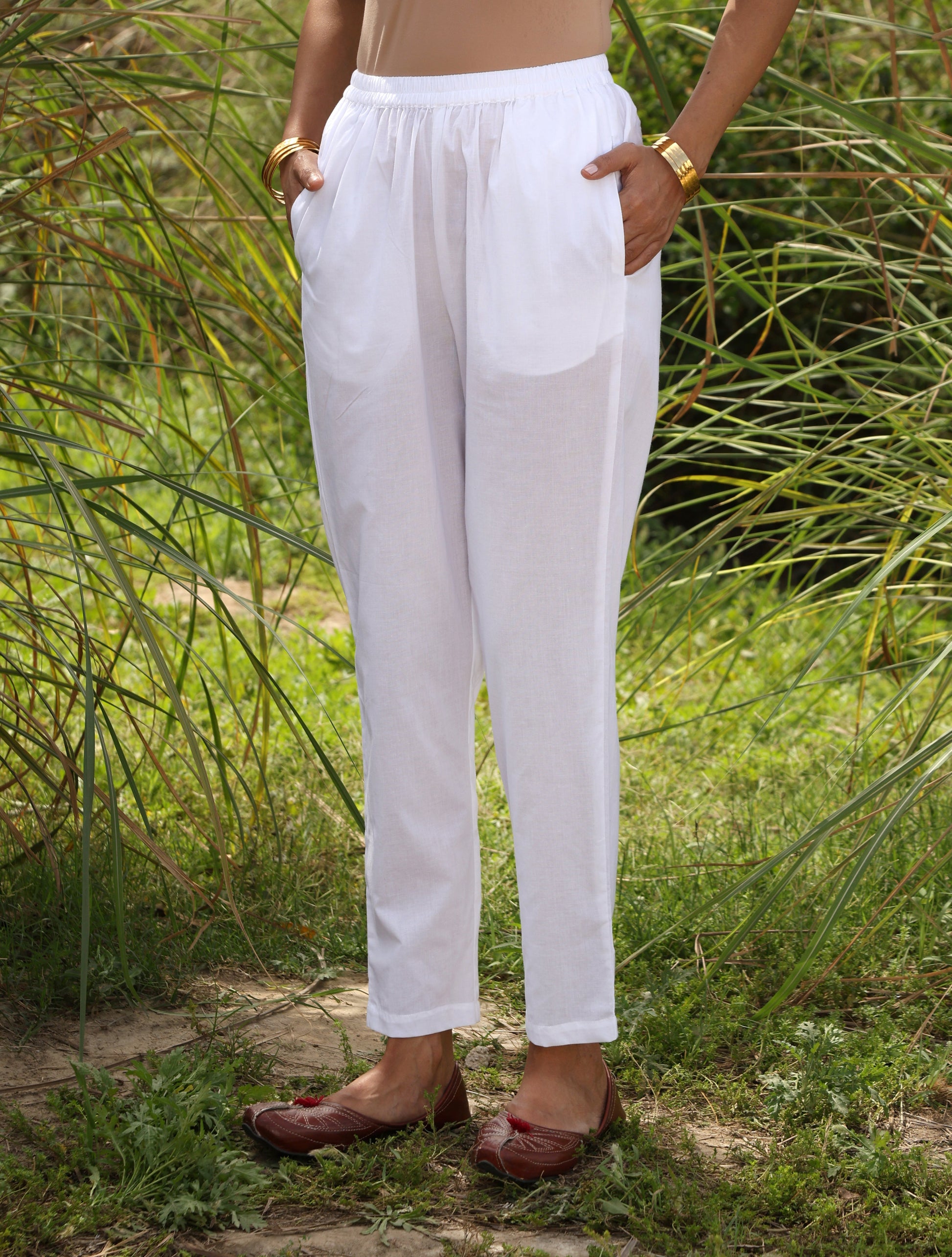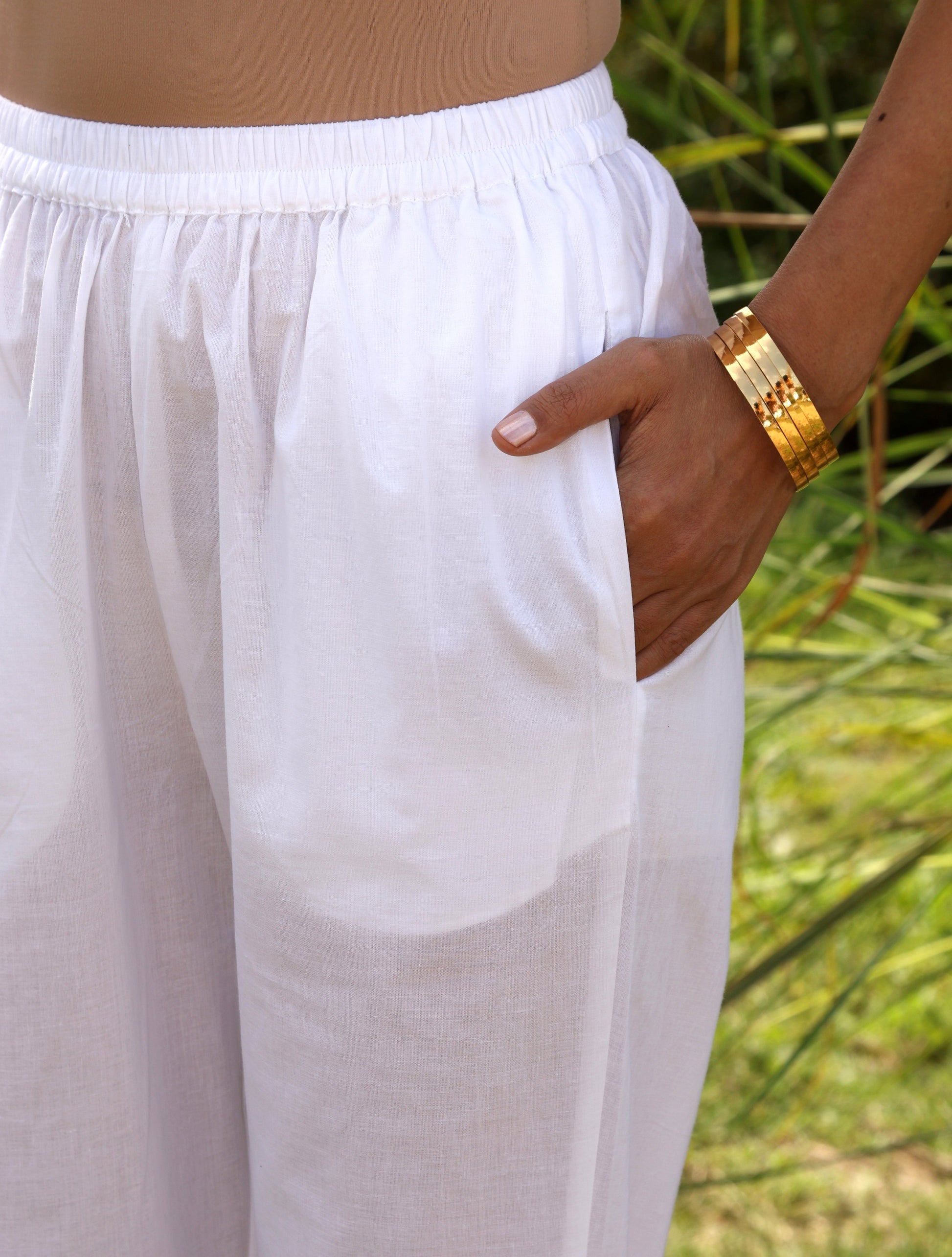 - Cotton Embroidered Anarkali Flared Kurta with overlap V-neckline, high side slits, gathered waist and three-fourth sleeves. Paired with solid elasticated waist pant.