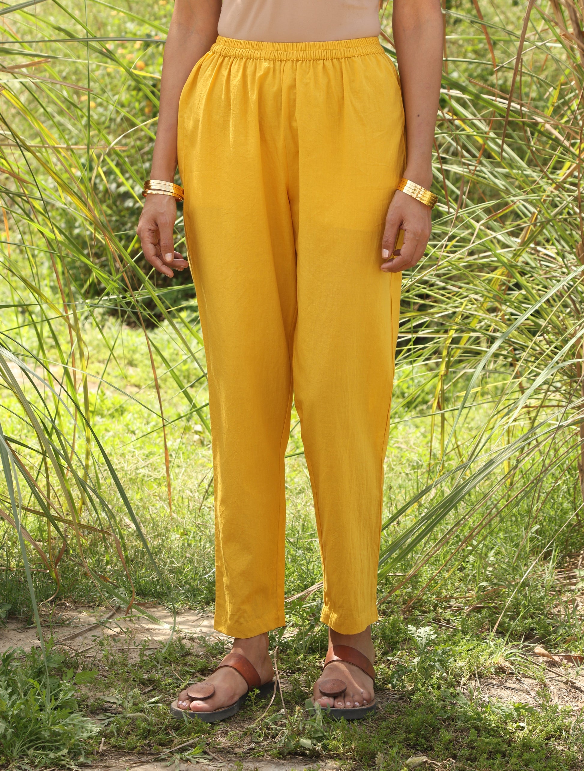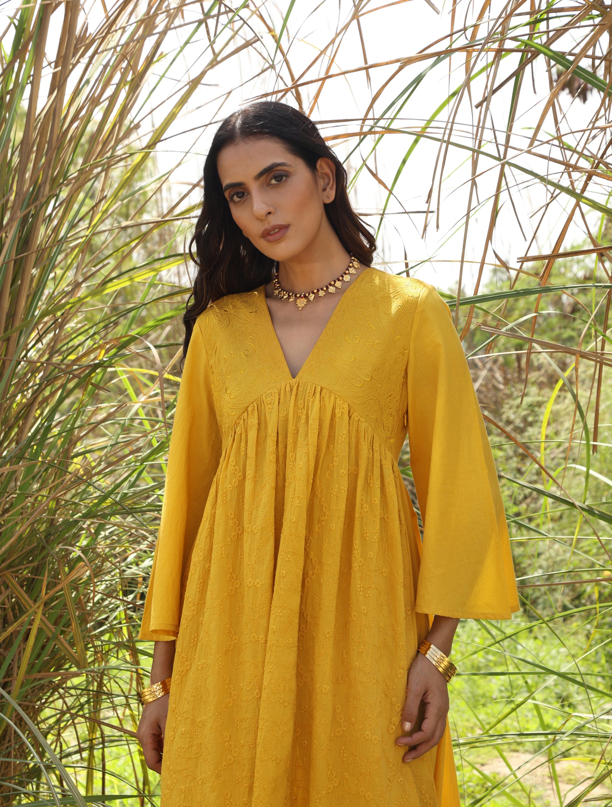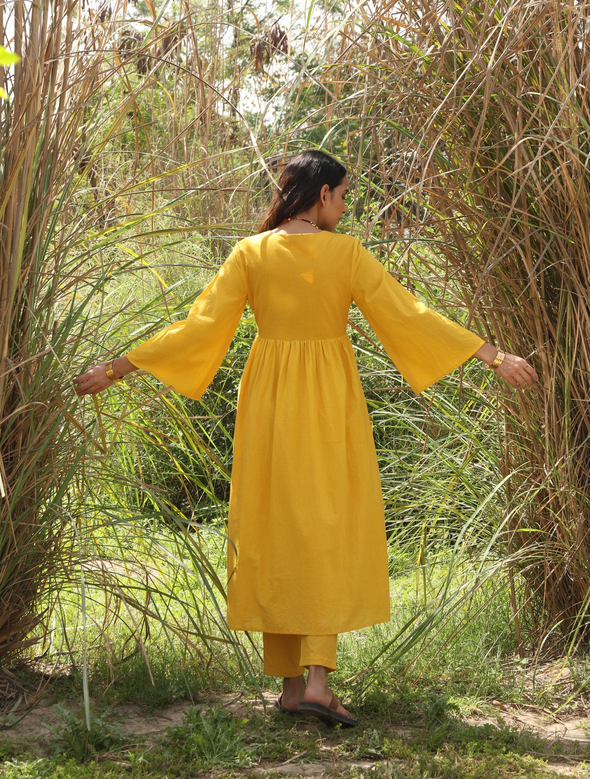 trueBrowns Mustard Cotton Embroidered Flared Kurta Set