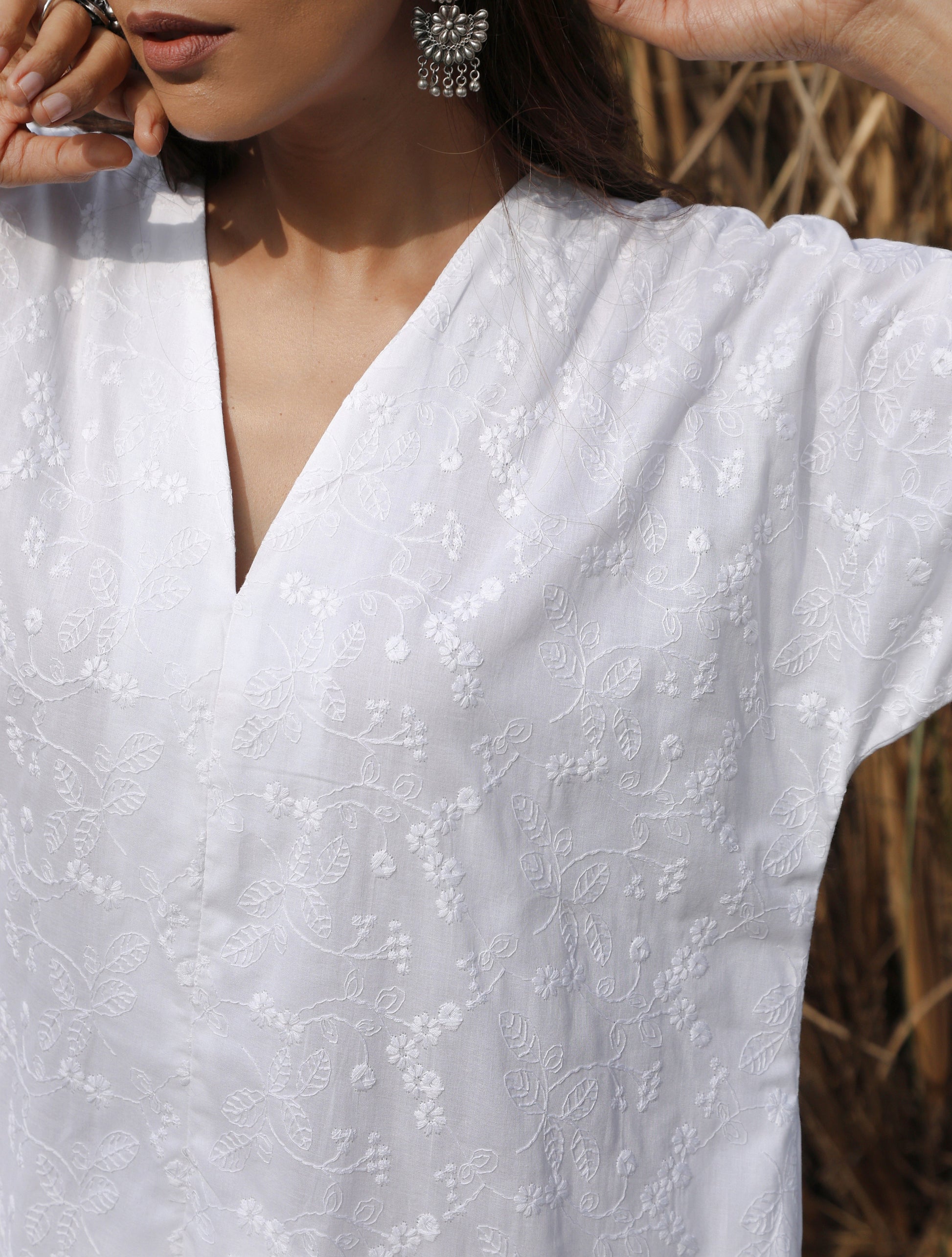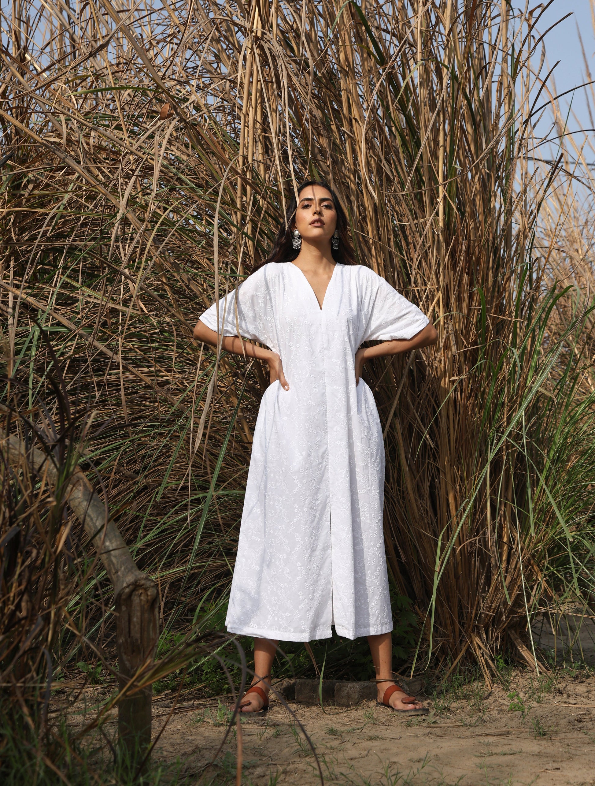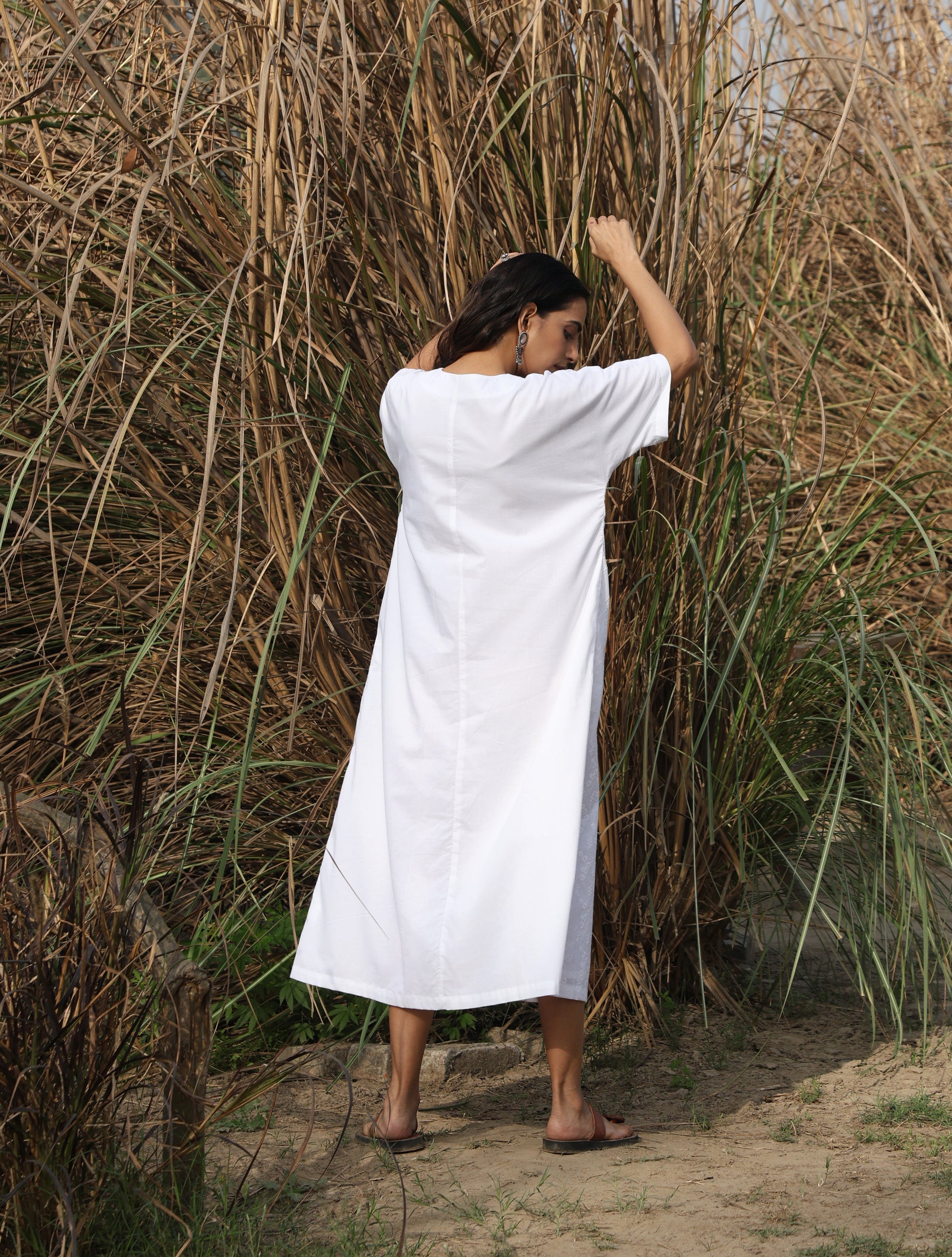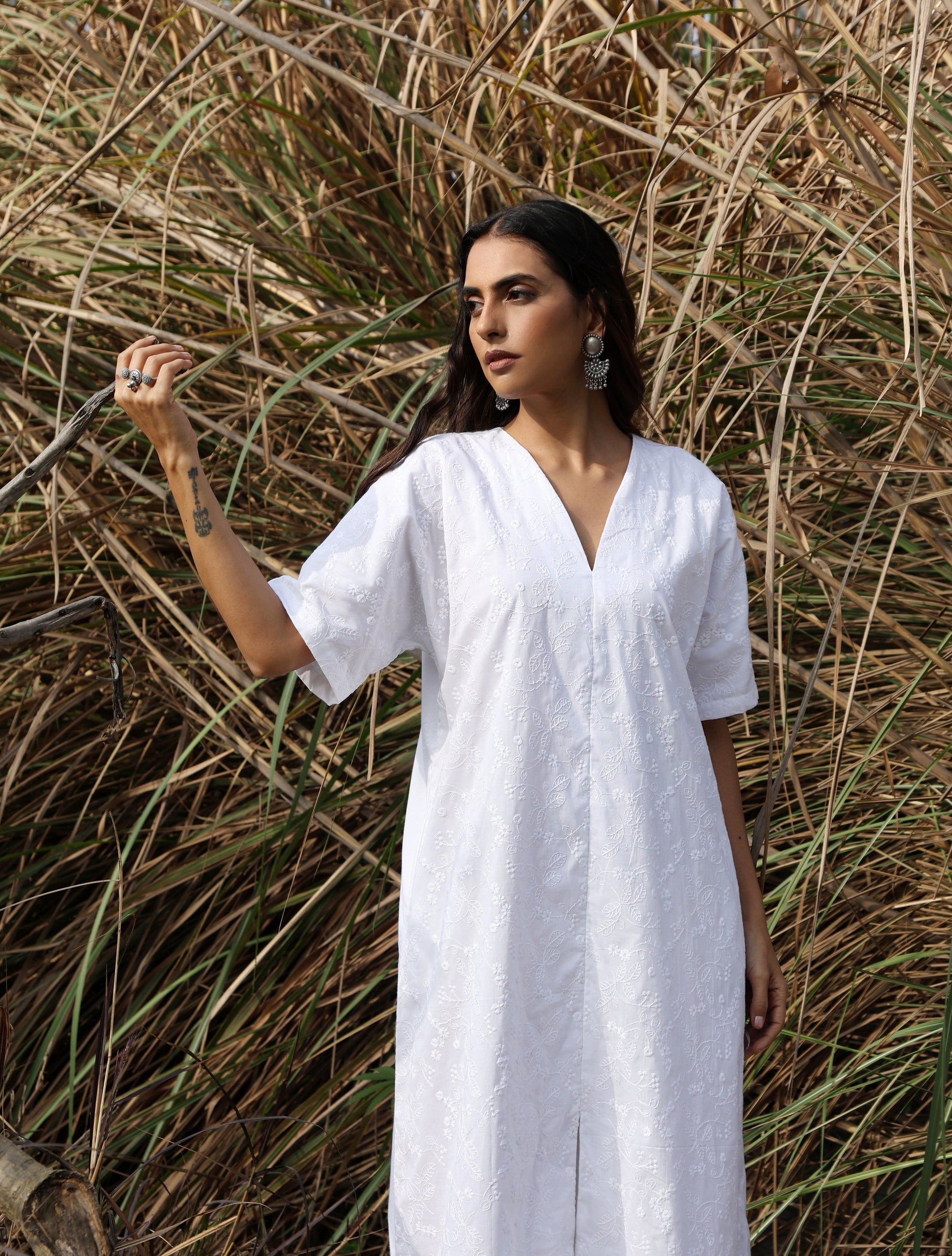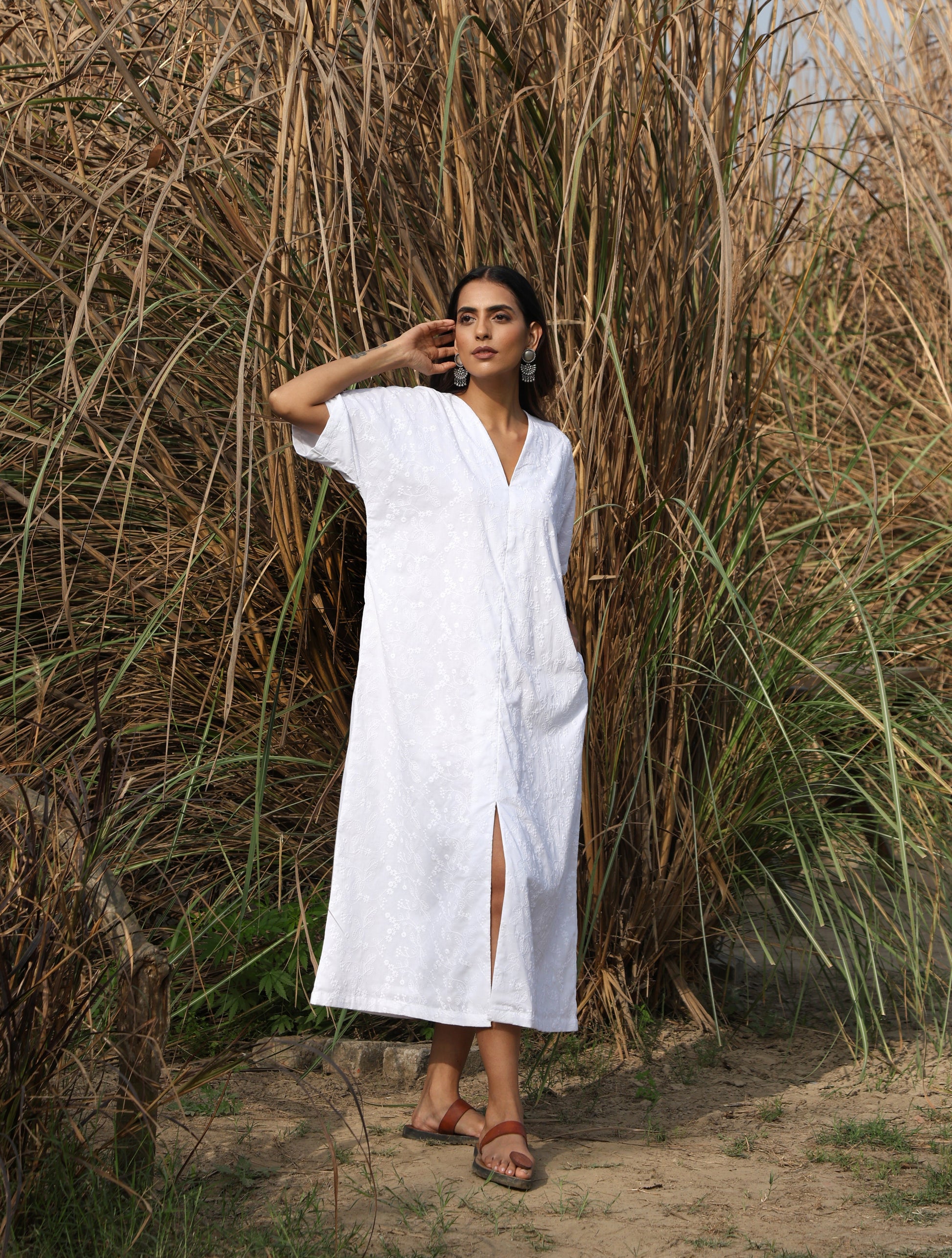 trueBrowns White Cotton Embroidered Front Slit Dress