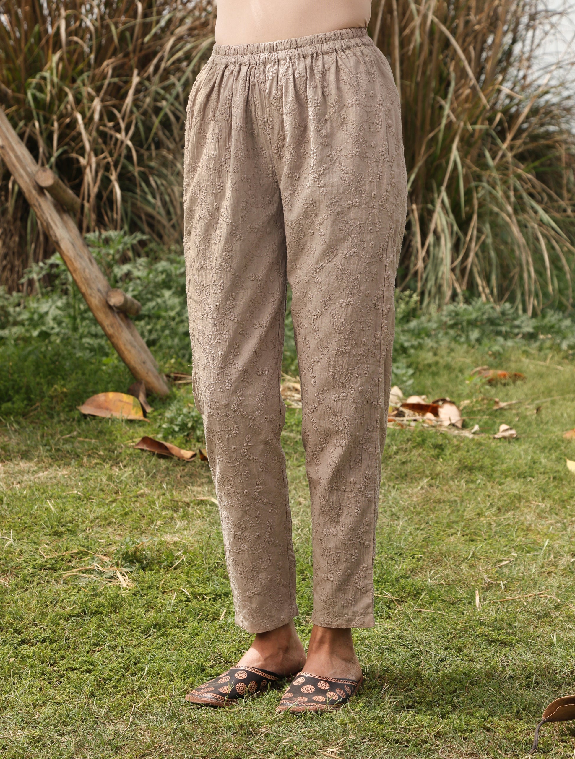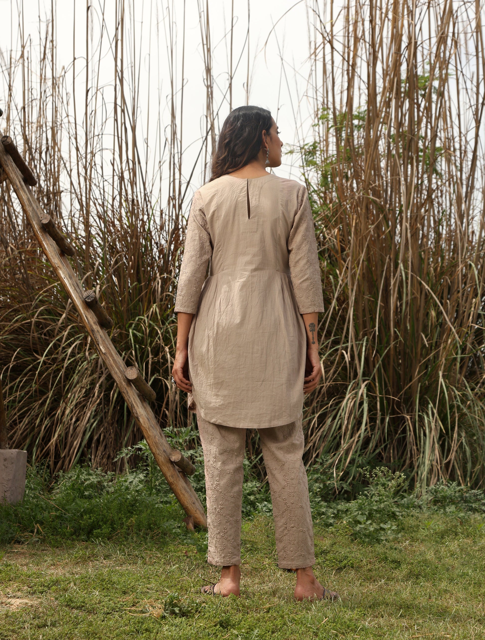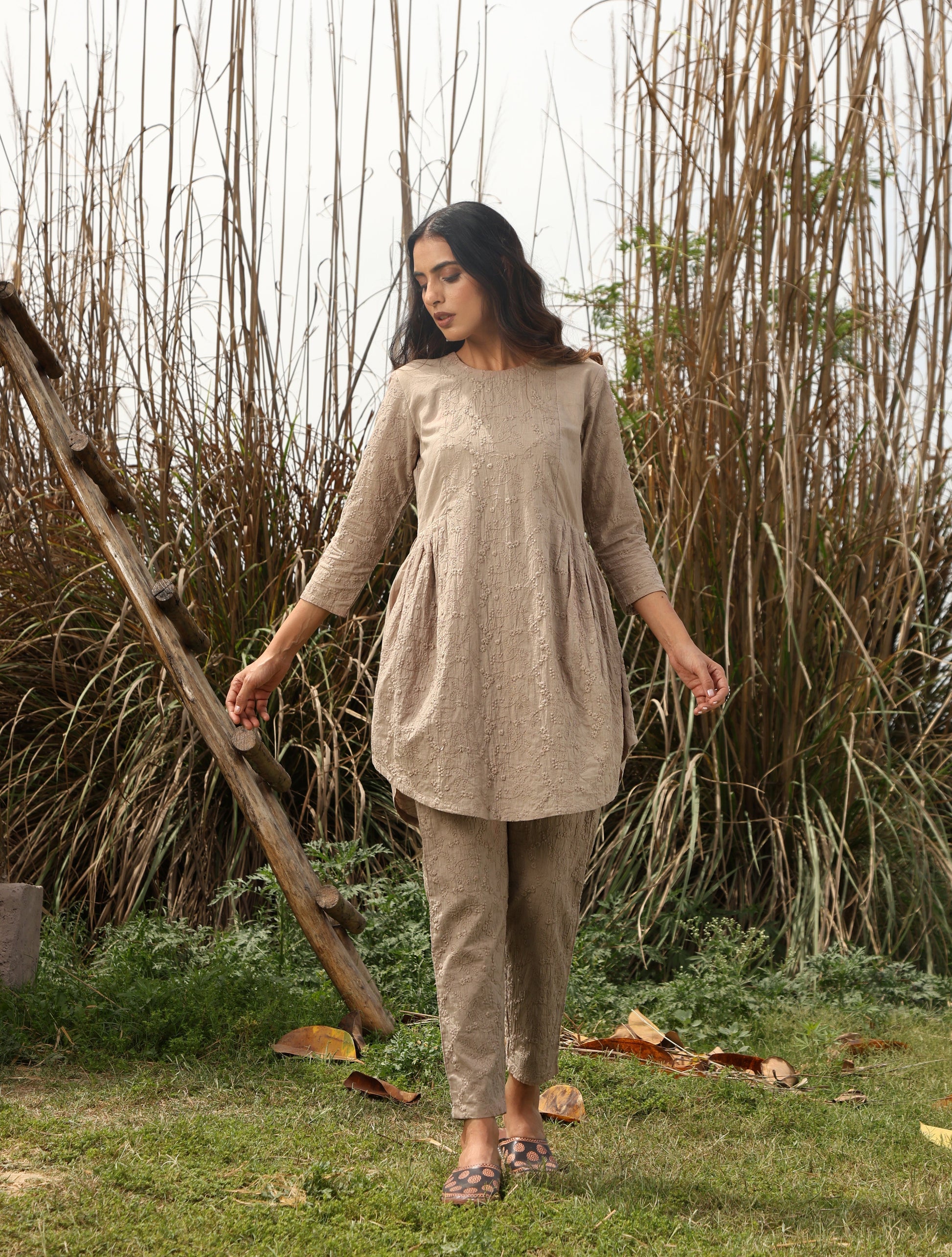 - Cotton embroidered co-ord set with side gathers, round neckline and three-fourth sleeves. Paired with elasticated waist pant.