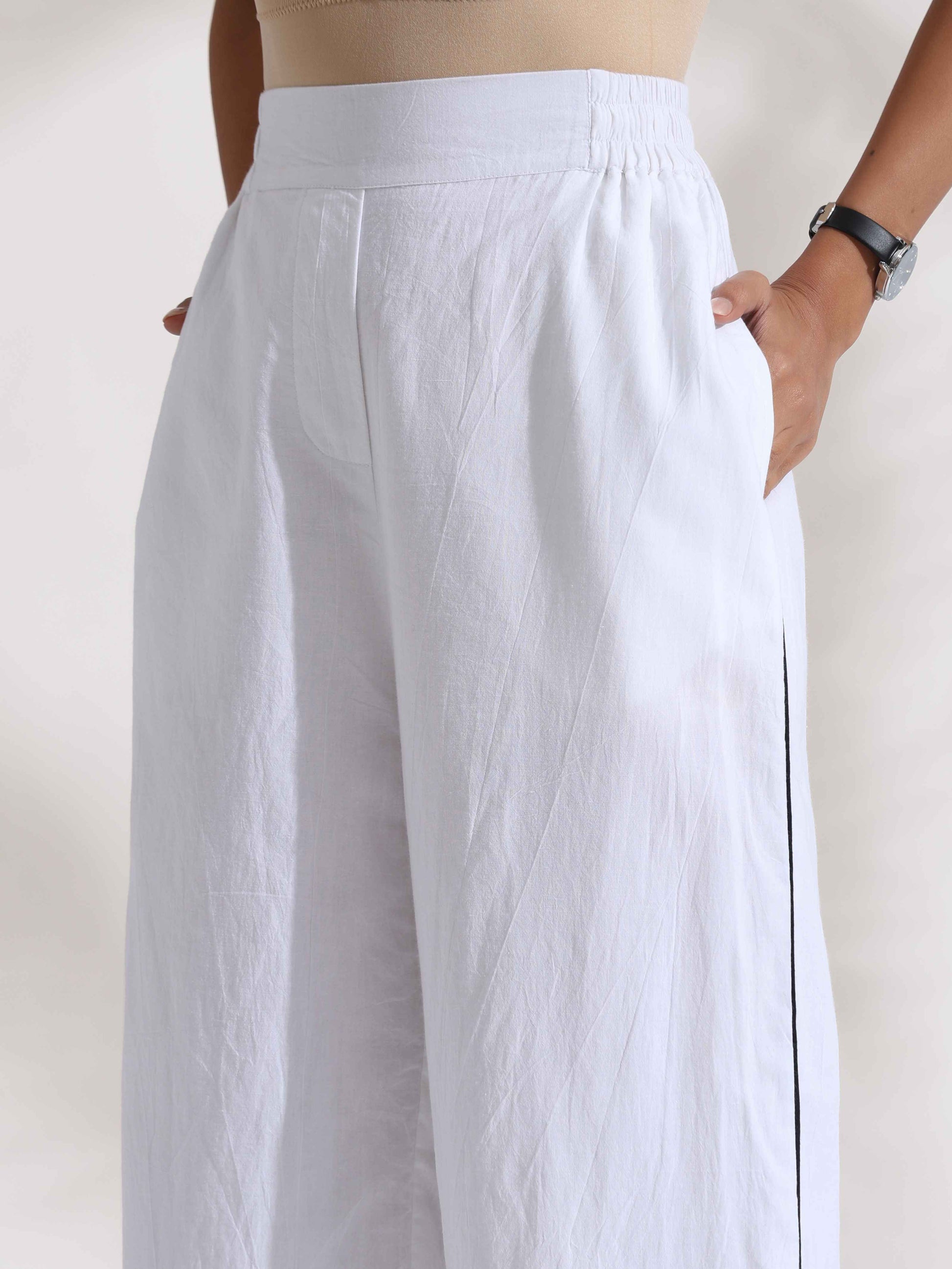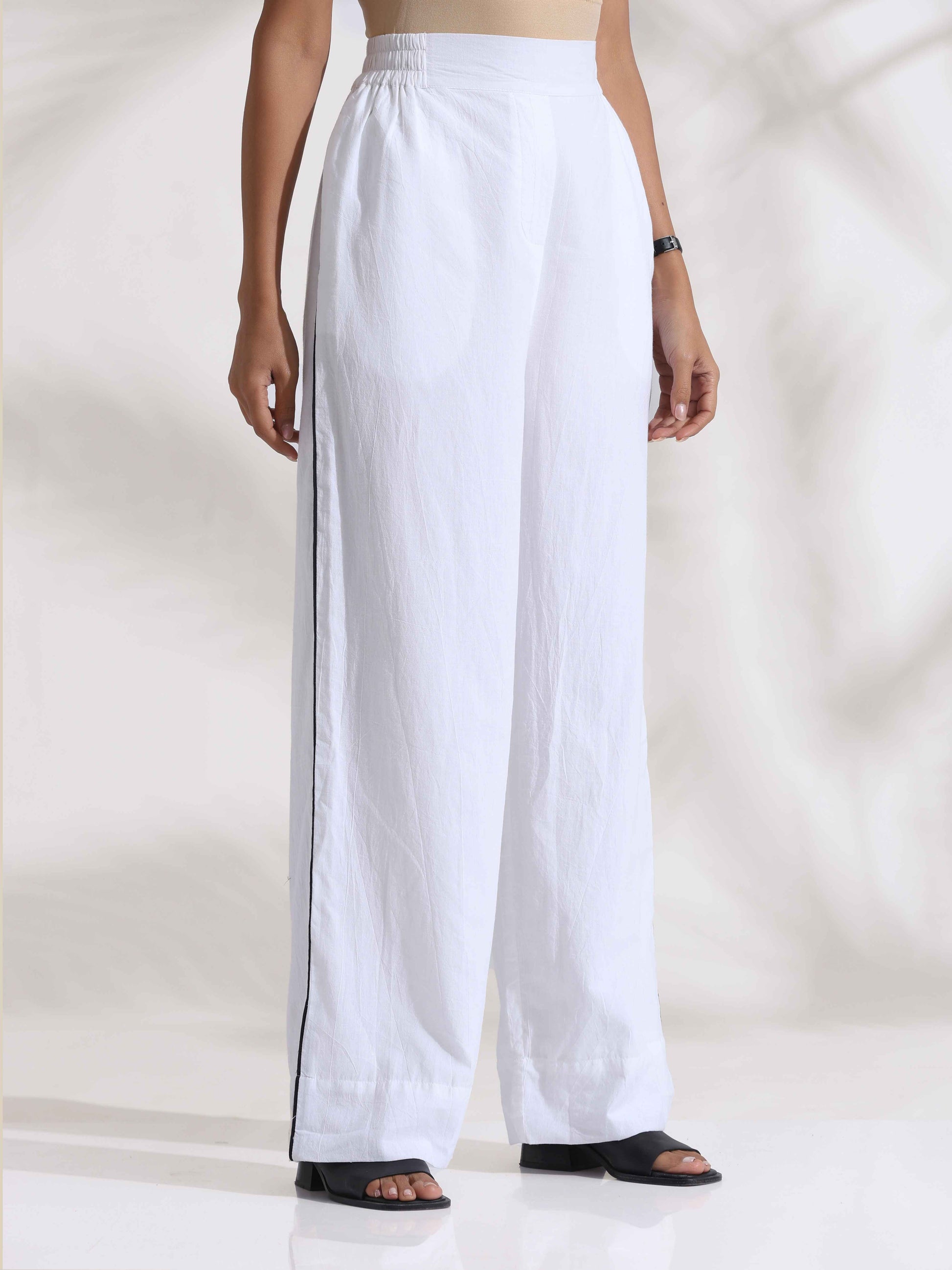 - Elevate your style with this white stripe print double breasted high-slit blazer complemented by white solid flared pants with black trim on the sides, it's an ideal blend of elegance and comfort.