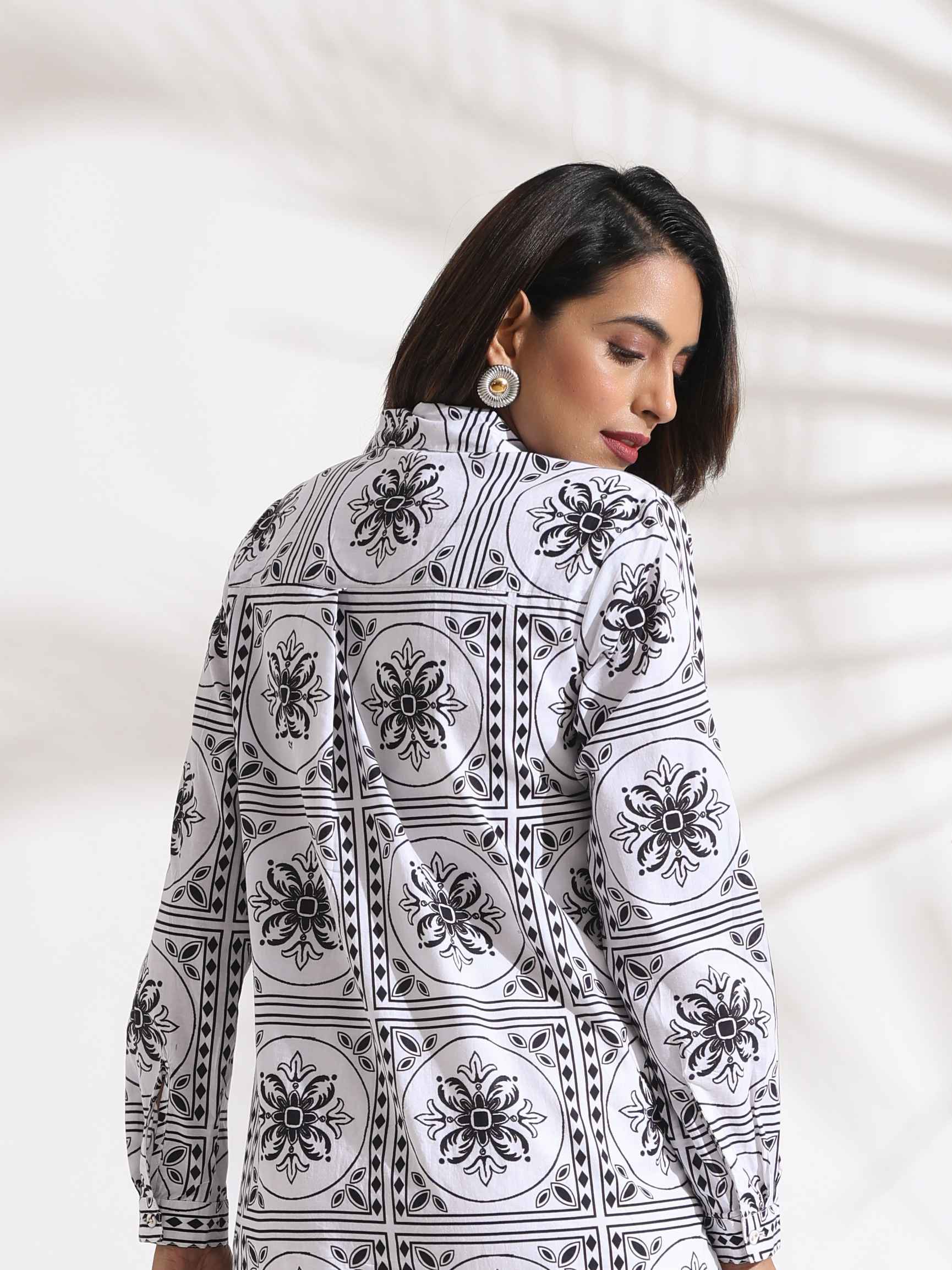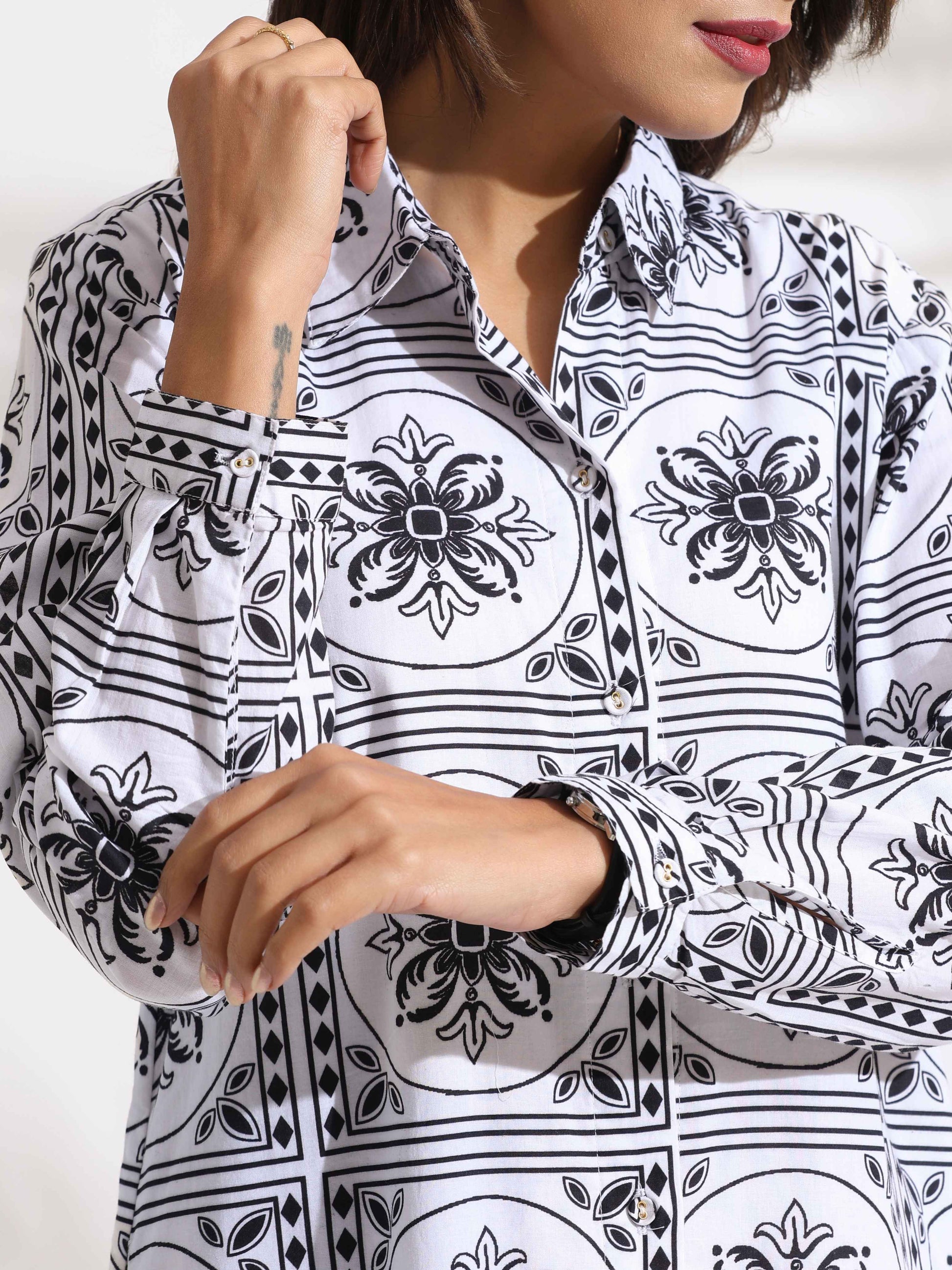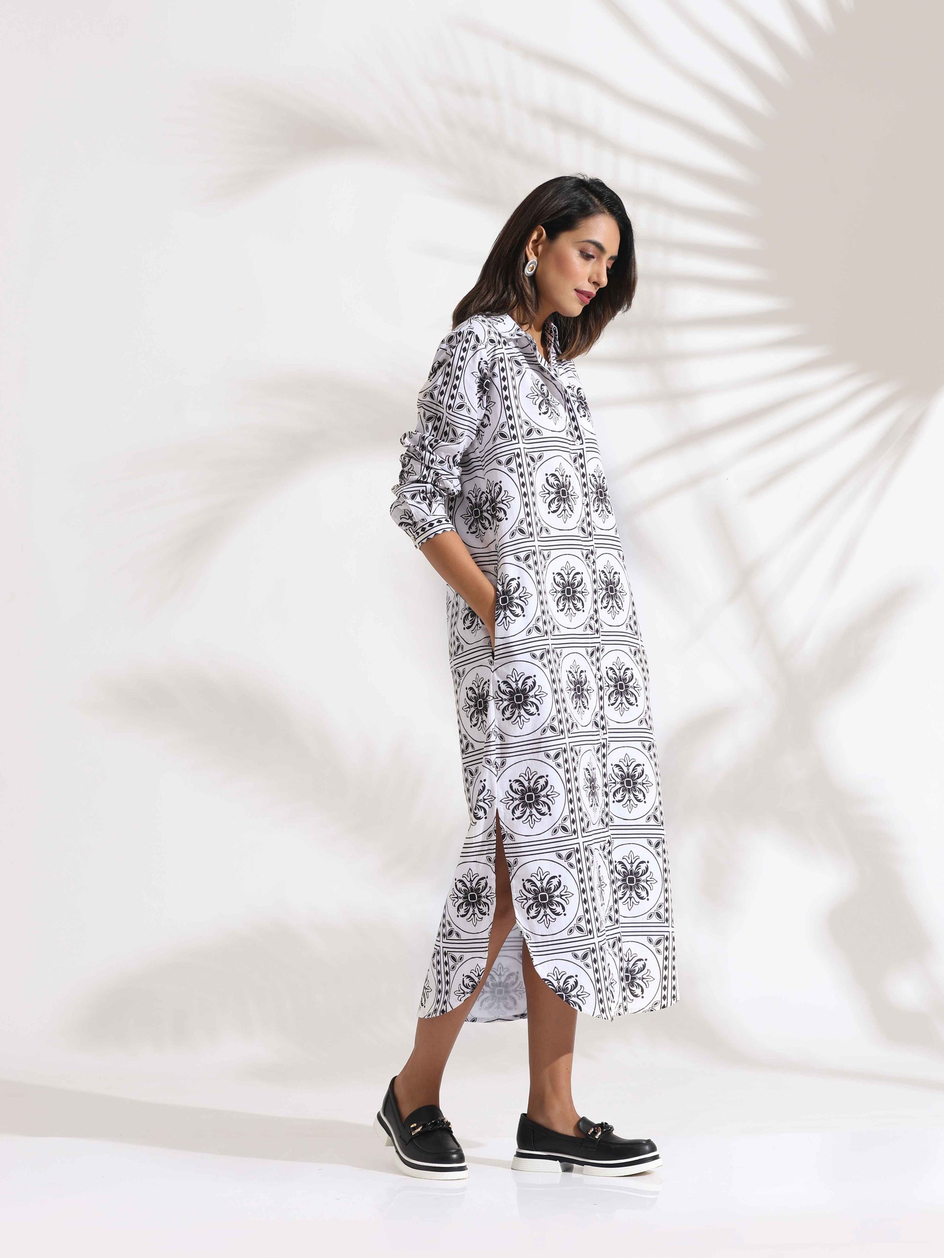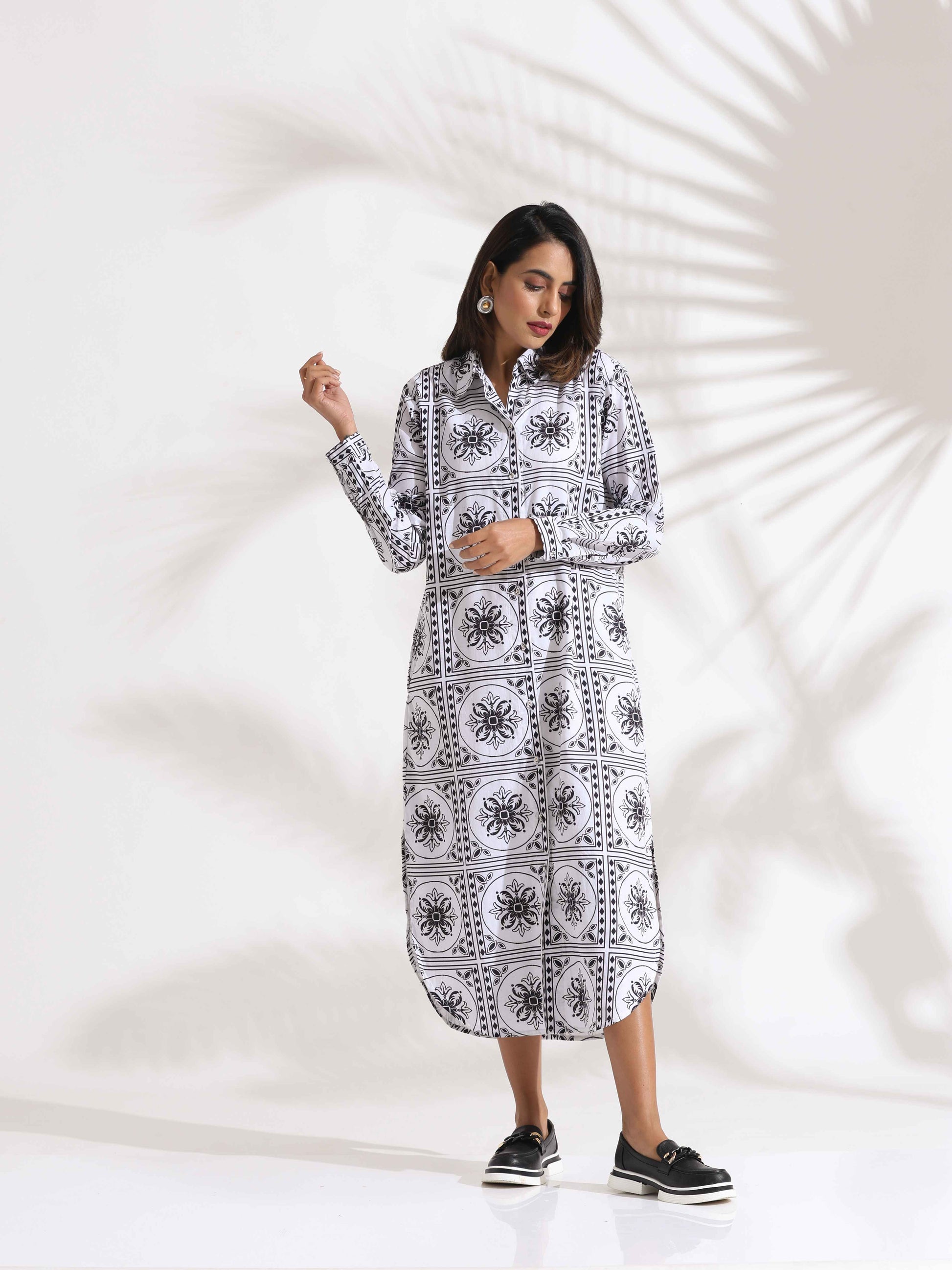 - Elevate your style with this printed cotton shirt dress, a perfect blend of elegance and comfort. Featuring a classic collar, button-down front, and side slits, it’s ideal for casual outings, office wear, or weekend brunches—effortlessly stylish and versatile.