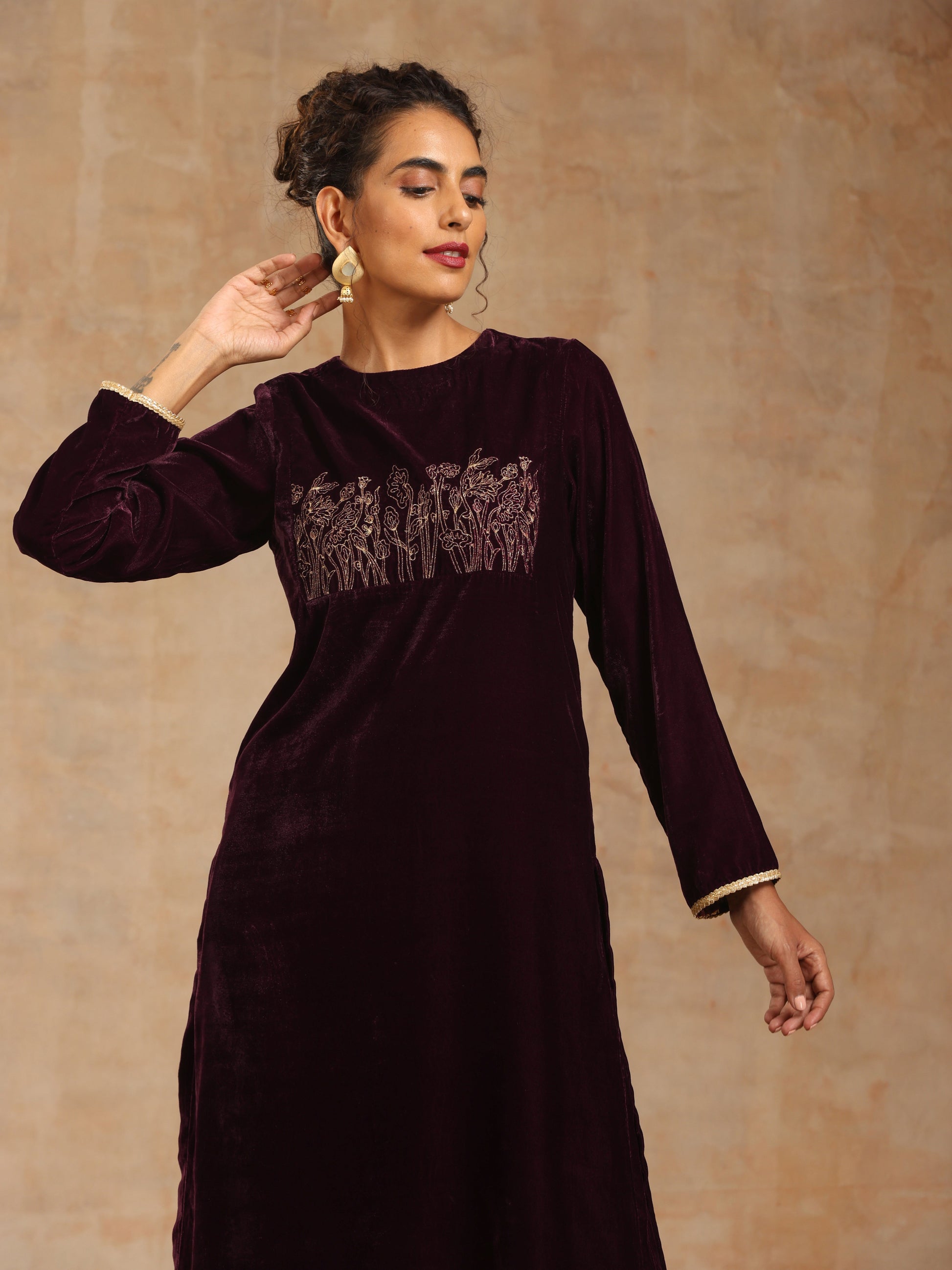 trueBrowns Wine Velvet Yoke Embroidered Kurta