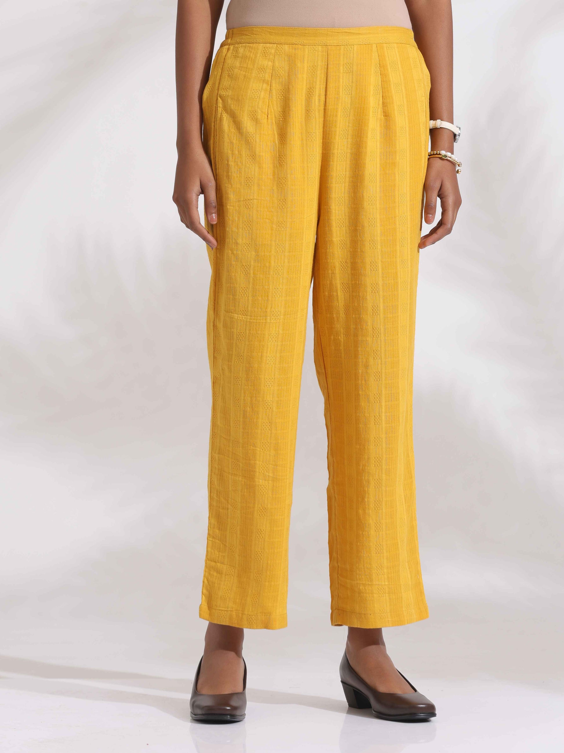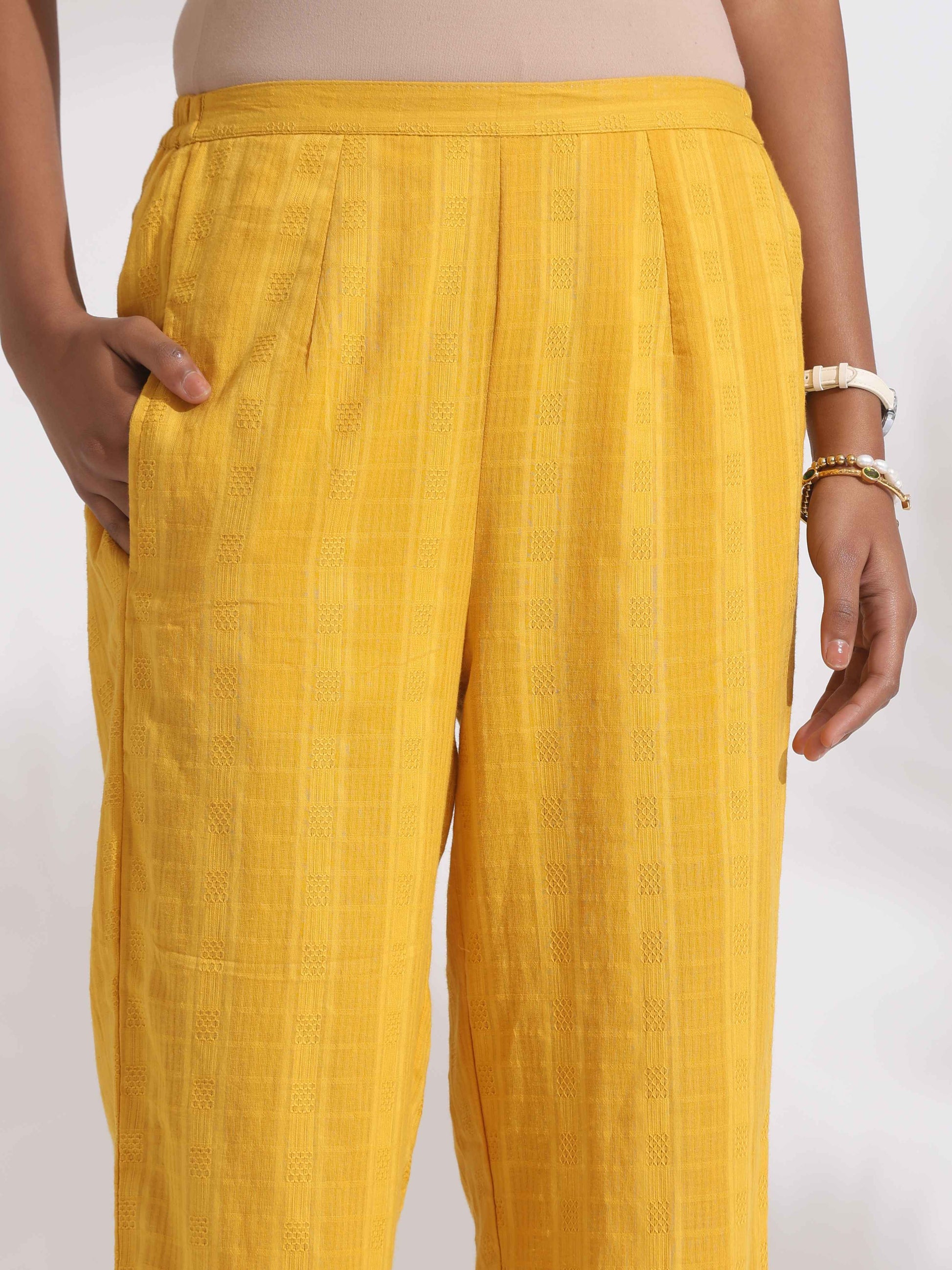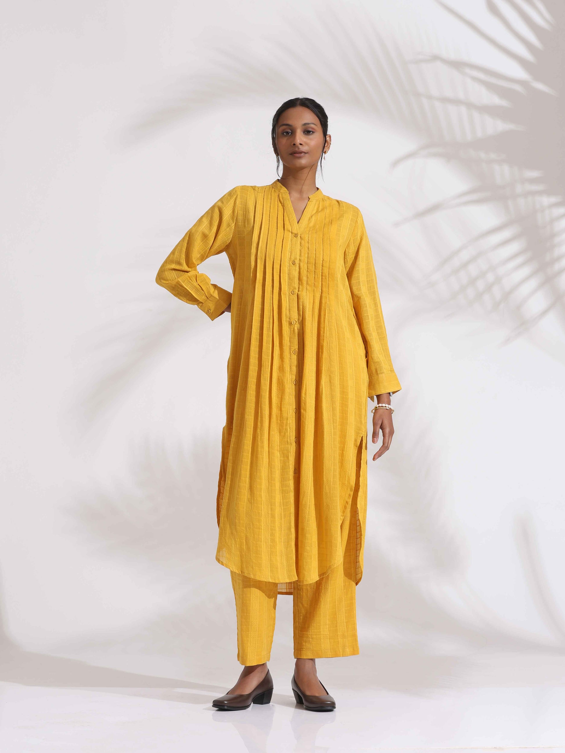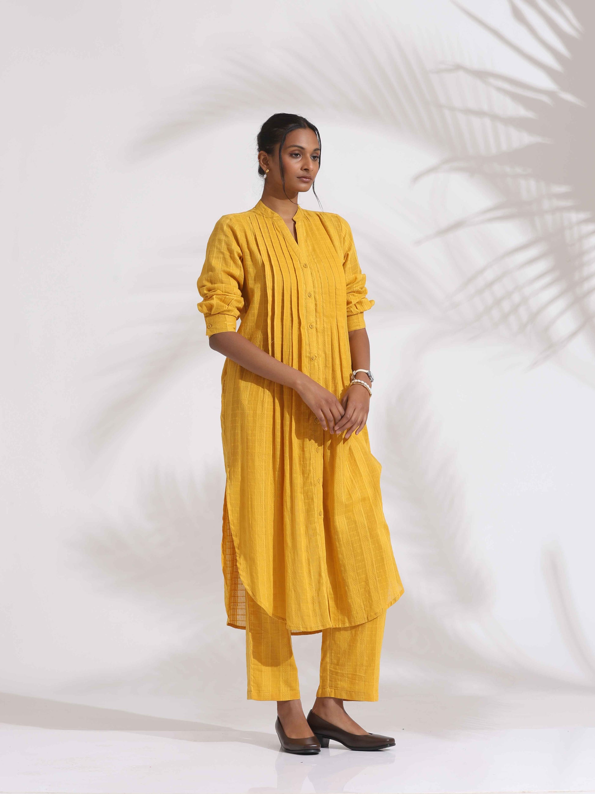- Elevate your style with this yellow cotton pleated shirt kurta, paired with matching pants.