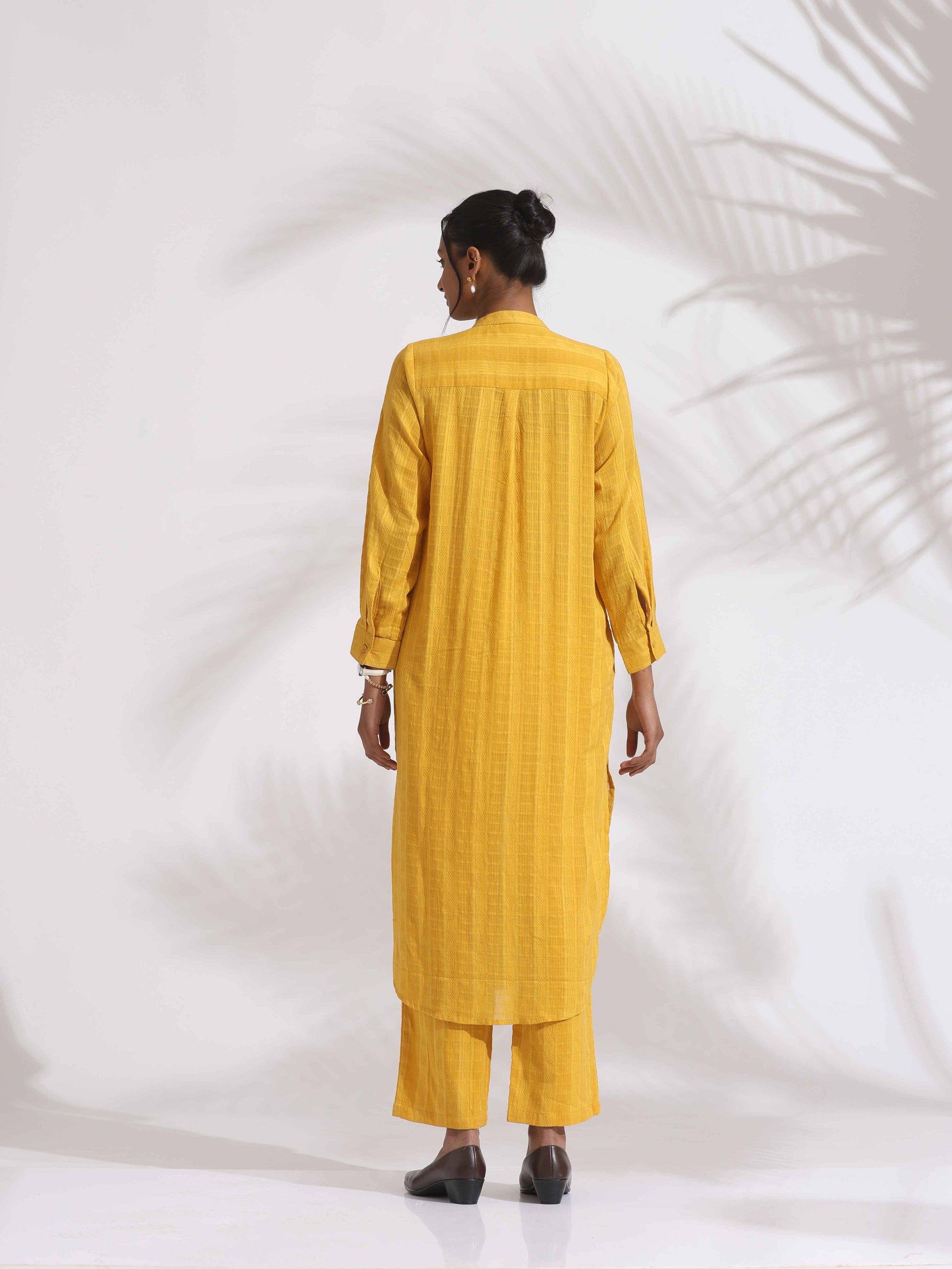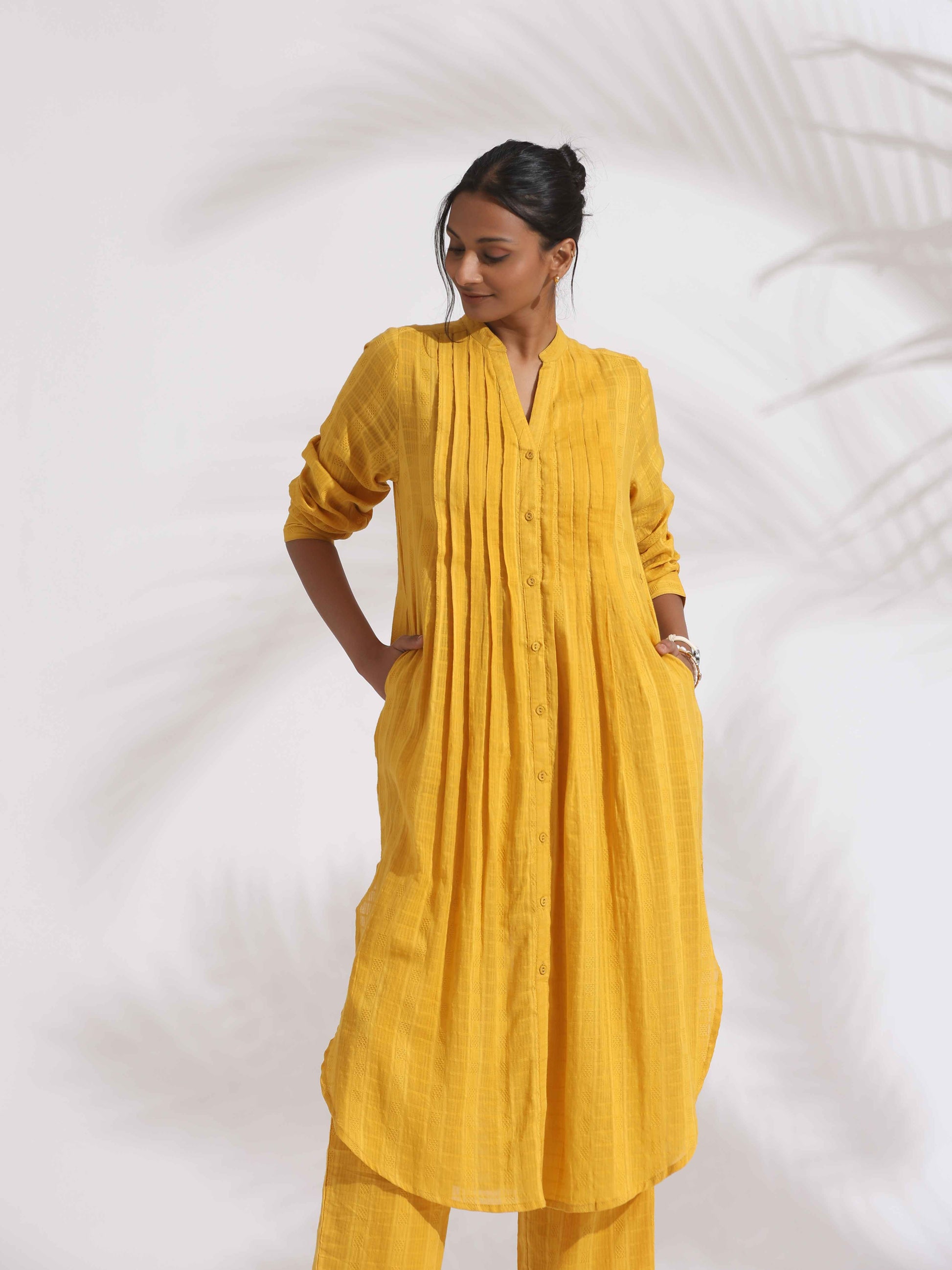 trueBrowns Yellow Cotton Pleated Shirt Kurta Set