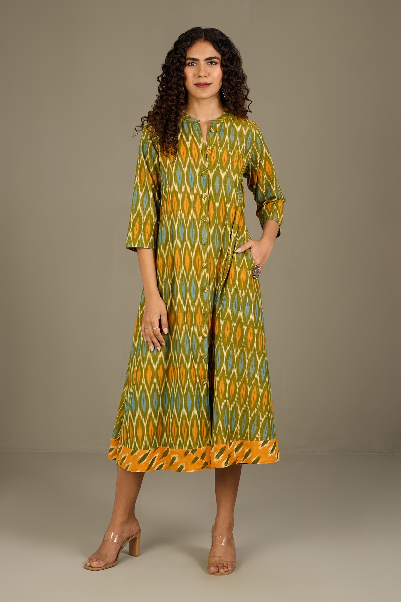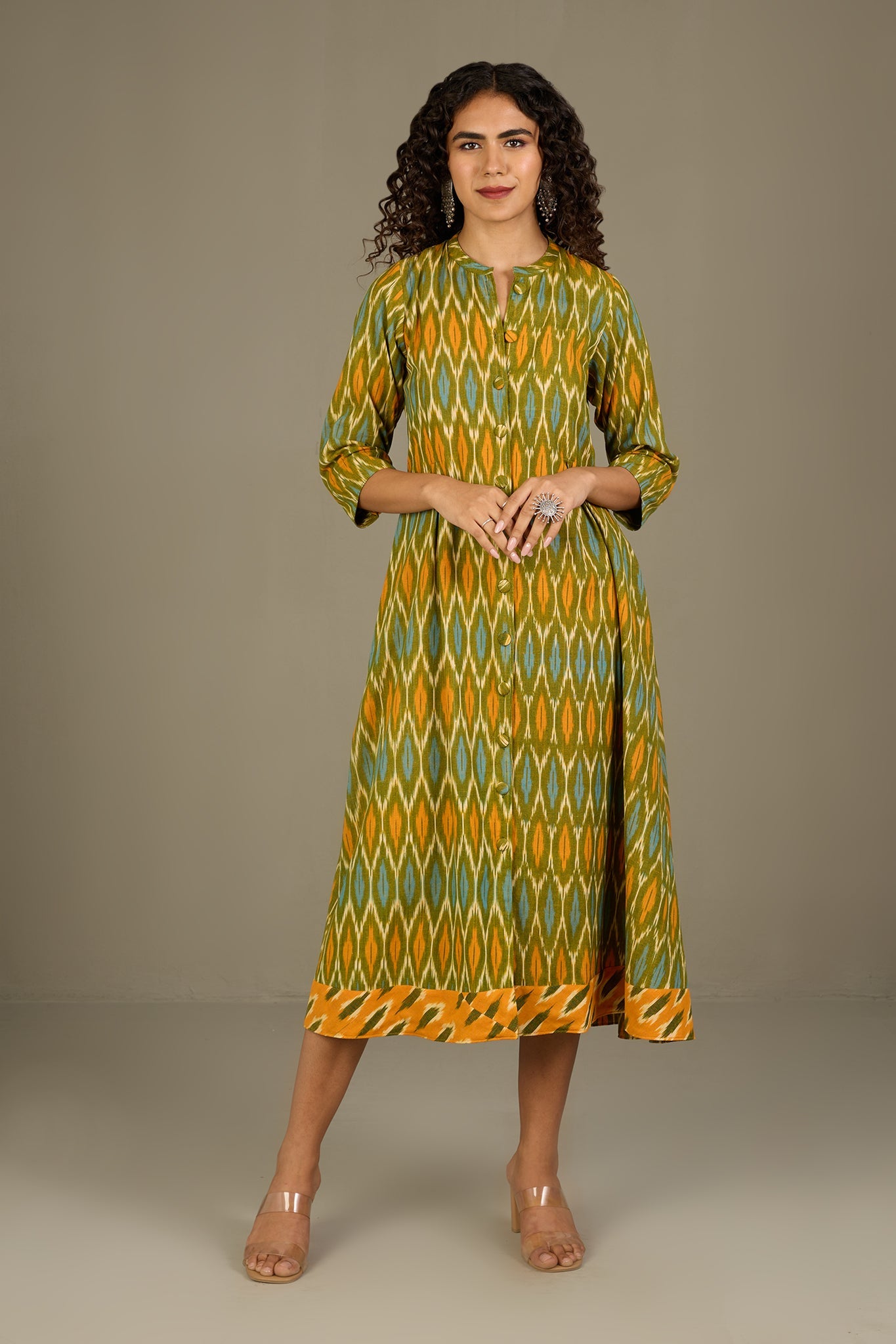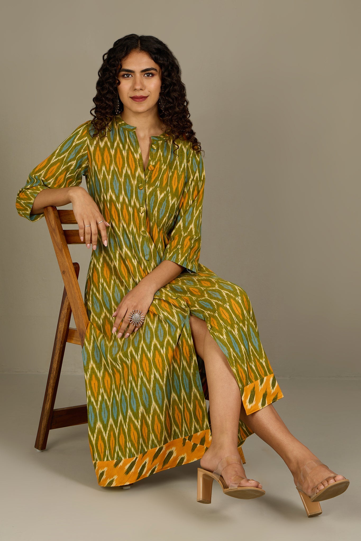 Maati Craft Verdant Gold Haze Long Button Down Ikat Maxi Dress