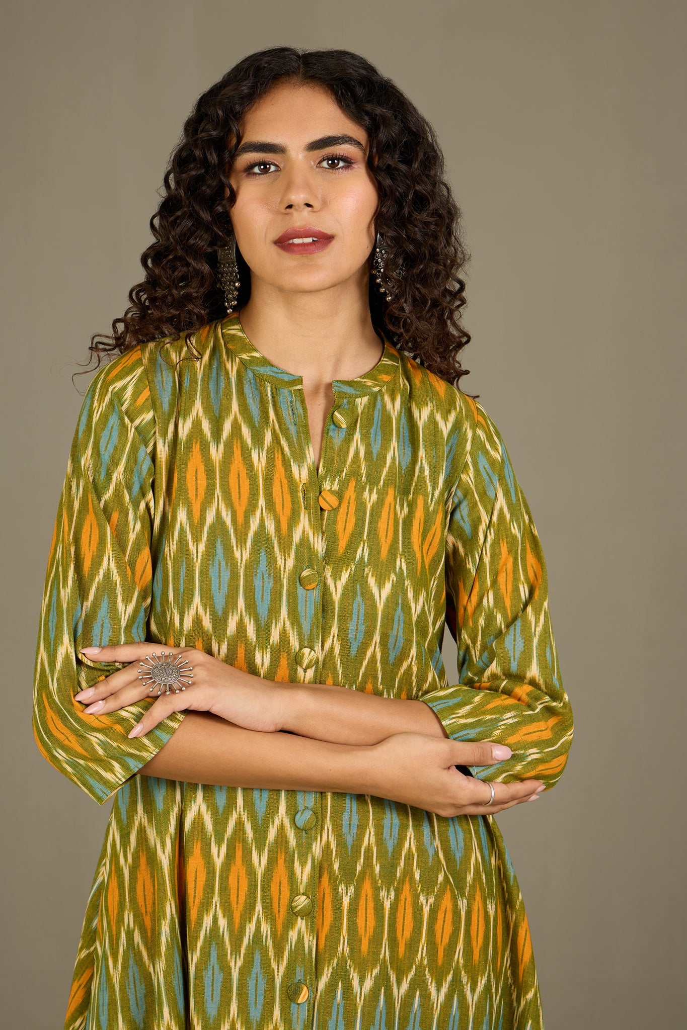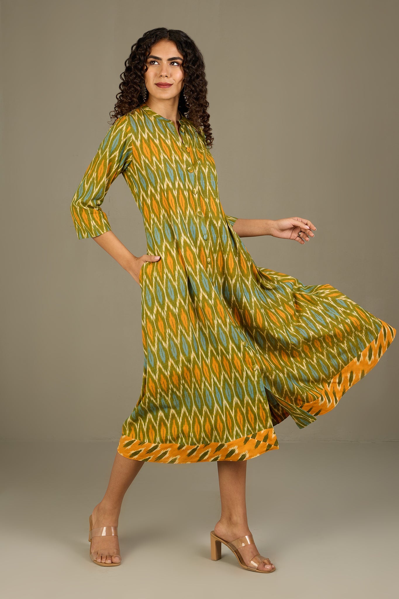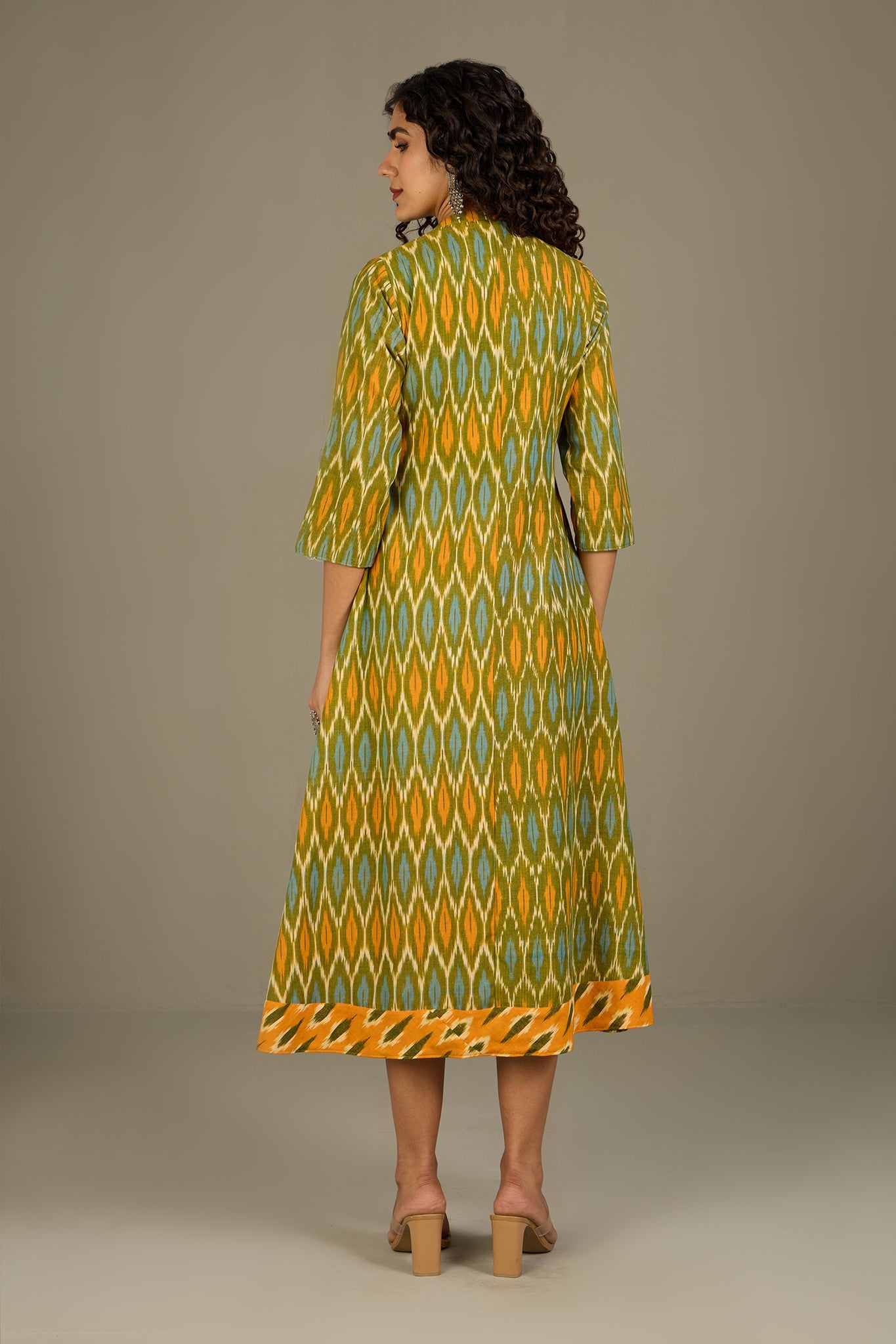 Maati Craft Verdant Gold Haze Long Button Down Ikat Maxi Dress