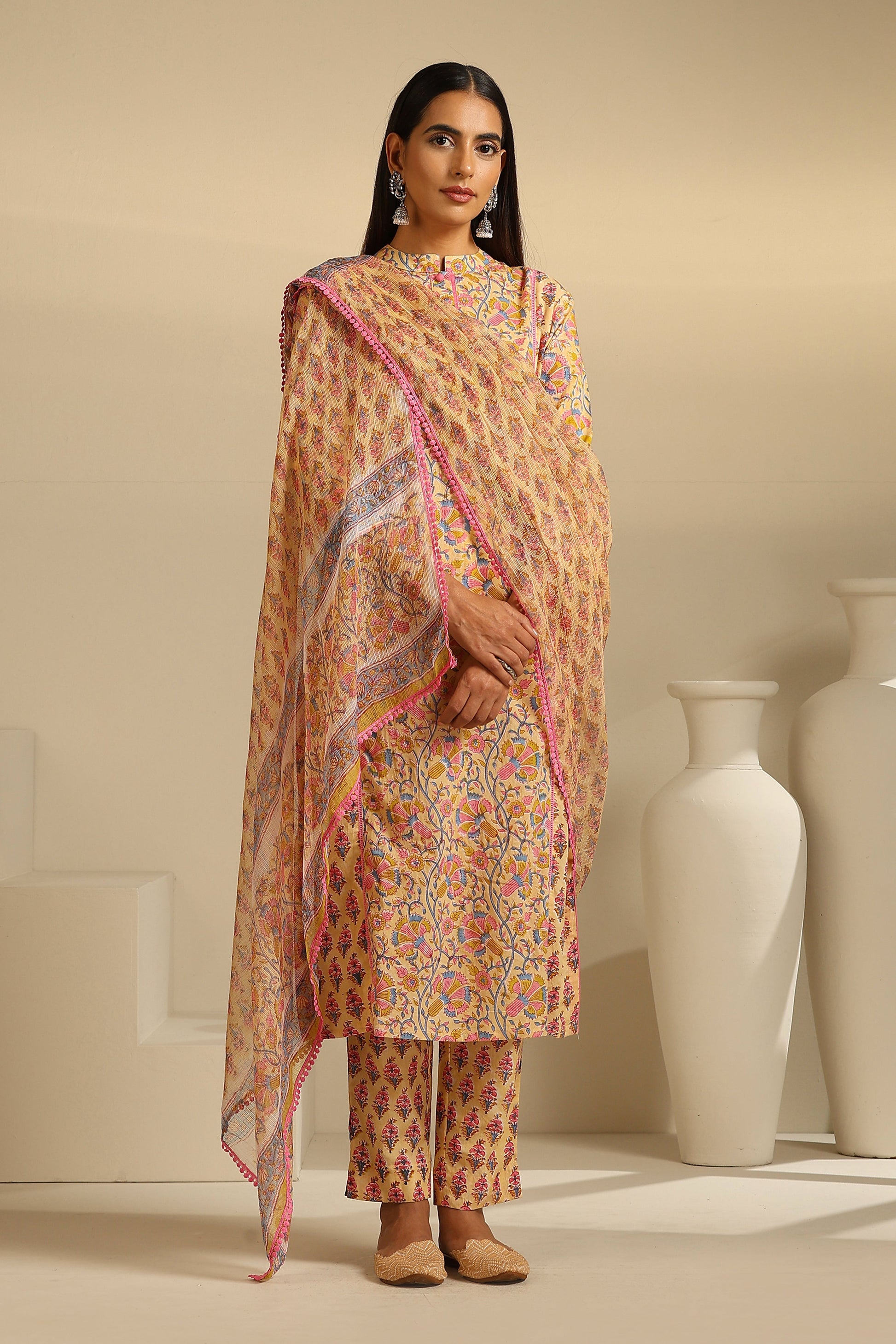 Our Yellow Lantana Floral Kurta Set showcases an attractive pink and blue hand-block printed floral pattern against a soothing pastel yellow color, making it the perfect outfit for an outdoor sunny luncheon! Expertly handcrafted in the softest cotton fabric, the kurta and dupatta are enhanced with delicate pink lace adding further charm to the outfit. The look is completed with matching straight pants and a whimsical kota doria dupatta.